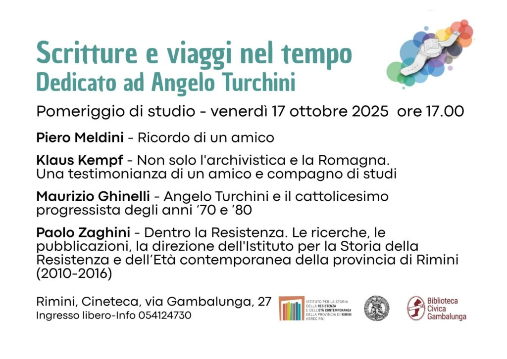In programma gli interventi di Piero Meldini (Ricordo di un amico), Klaus Kempf (Non solo l’archivistica e la Romagna. Una testimonianza di un amico e compagno di studi), Maurizio Ghinelli (Angelo Turchini e il cattolicesimo progressista degli anni ‘70 e ’80) e Paolo Zaghini (Dentro la Resistenza. Le ricerche, le pubblicazioni, la direzione dell’Istituto per la Storia della Resistenza e dell’Età contemporanea della provincia di Rimini, 2010-2016).