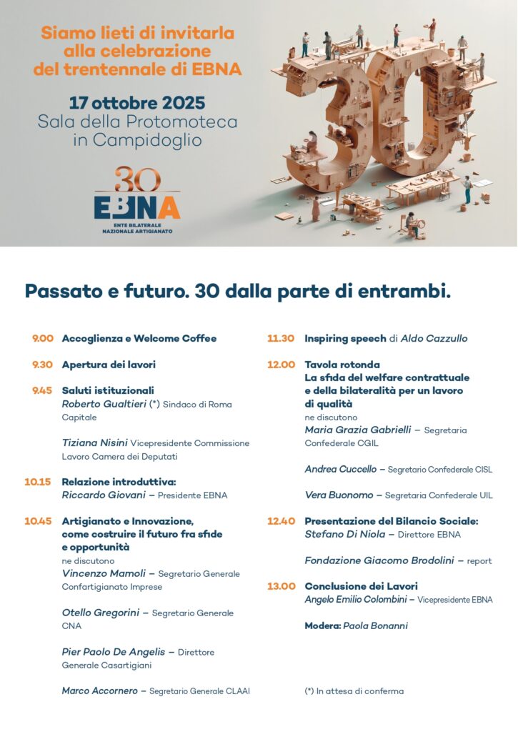 Il programma prevede due tavole rotonde con i Segretari Generali delle Confederazioni Artigiane e delle Organizzazioni Sindacali, un intervento ispirazionale di Aldo Cazzullo e la presentazione ufficiale del Bilancio Sociale EBNA 2024, che racconta una rete di prossimità e partecipazione a servizio di imprese e lavoratori.