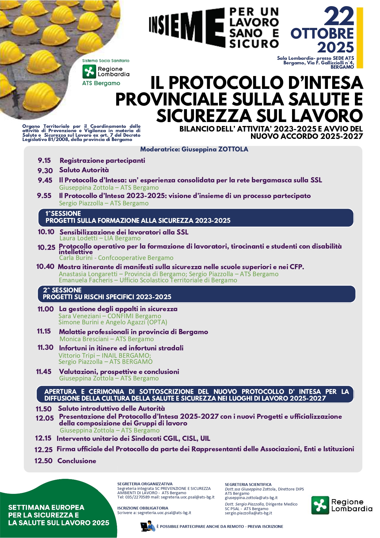 In chiusura dell’evento in locandina, verranno presentati i progetti futuri dell’Organismo Territoriale di Coordinamento (OTC). Invitiamo la S.V. a seguire e documentare la sessione finale -con firma del nuovo Protocollo-, mercoledì 22 ottobre 2025 in ATS Bergamo, sala Lombardia, dalle 11:50 alle 12:50 circa.