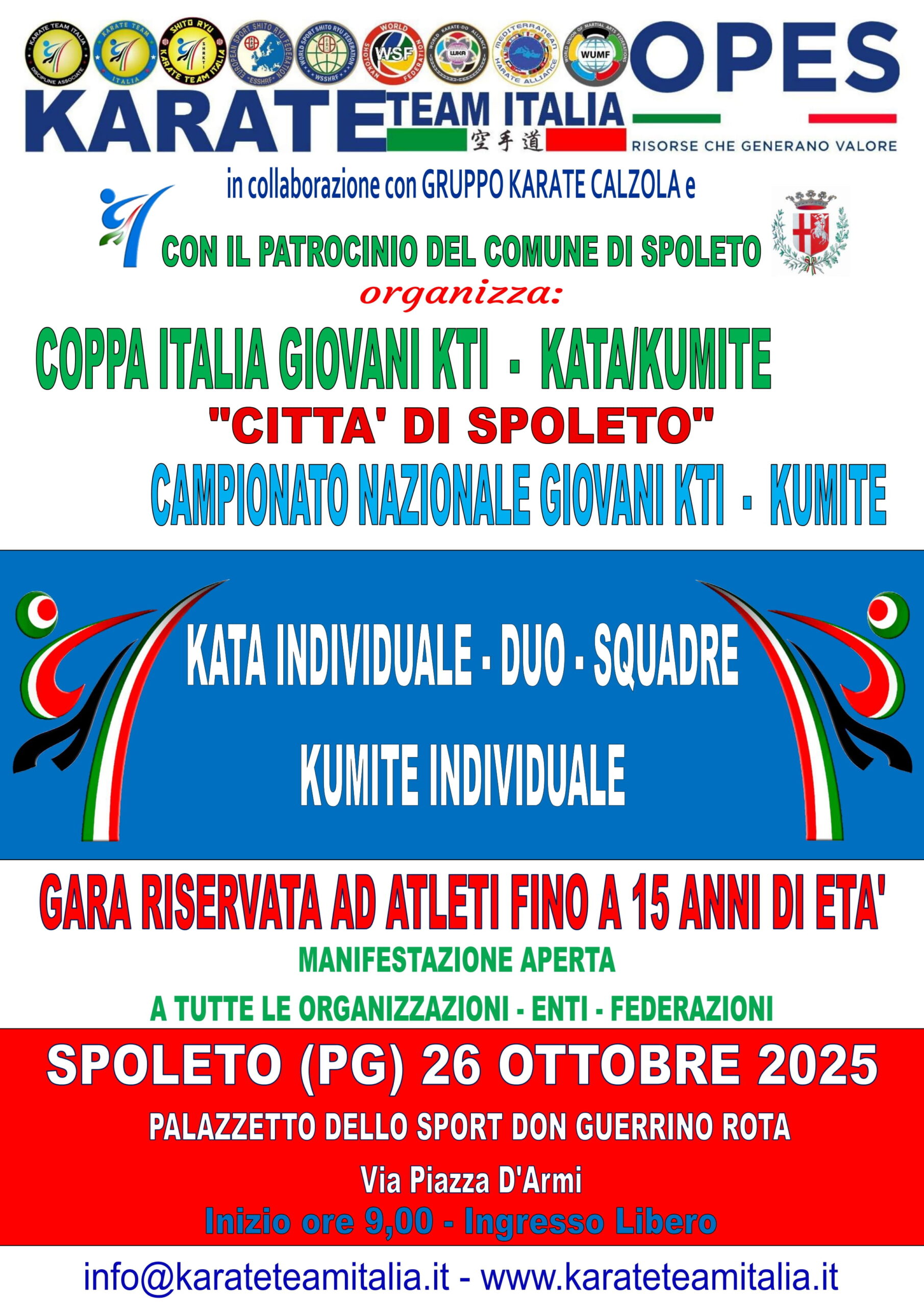 Si terrà domenica 26 ottobre dalle ore 8.00 alle ore 18.00 al Palazzetto Don Guerrino Rota di Spoleto una manifestazione interamente dedicata al karate realizzata dalla Karate Team Italia & D.A. in collaborazione con il Gruppo Karate Calzola del Maestro Lorenzo Calzola, diretta dai dirigenti della Karate Team italia Maestro Pietro Antonacci (Presidente) e Elsa Epifani (Segreteria), con il patrocinio del Comune di Spoleto e inserita nel palinsesto degli eventi di “Accade d’autunno a Spoleto”.