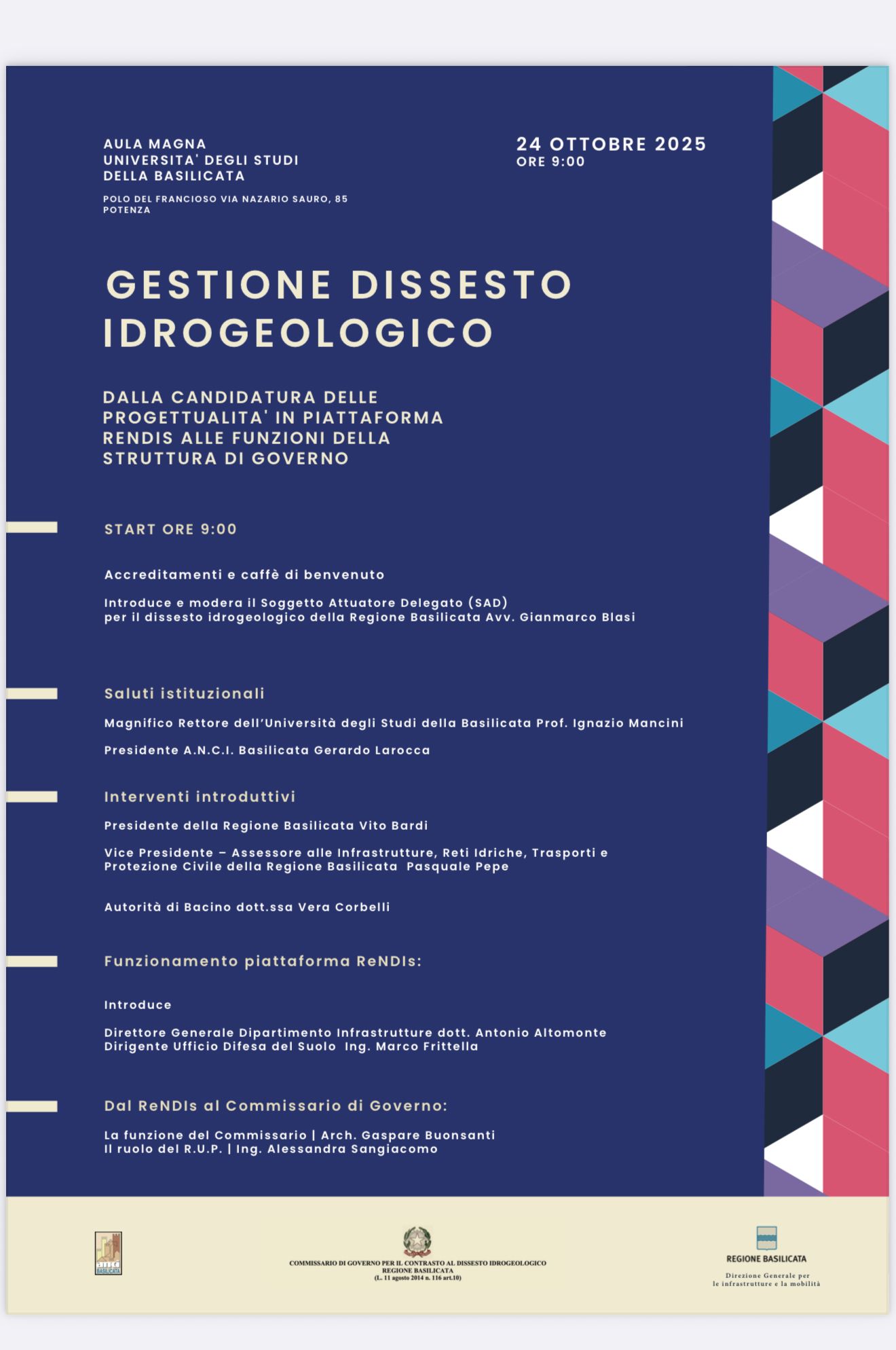 Il commissario di Governo per il contrasto al dissesto idrogeologico, la Direzione Generale per le Infrastrutture della Regione Basilicata e l’Anci (Associazione Nazionale Comuni Italiani) promuovono una giornata formativa dal titolo “Gestione dissesto idrogeologico: dalla candidatura delle progettualità in piattaforma ReNDiS alle funzioni della struttura di Governo”, in programma il 24 ottobre 2025 alle ore 9.00 nell’Aula Magna dell’Università degli Studi della Basilicata, in rione Francioso a Potenza.