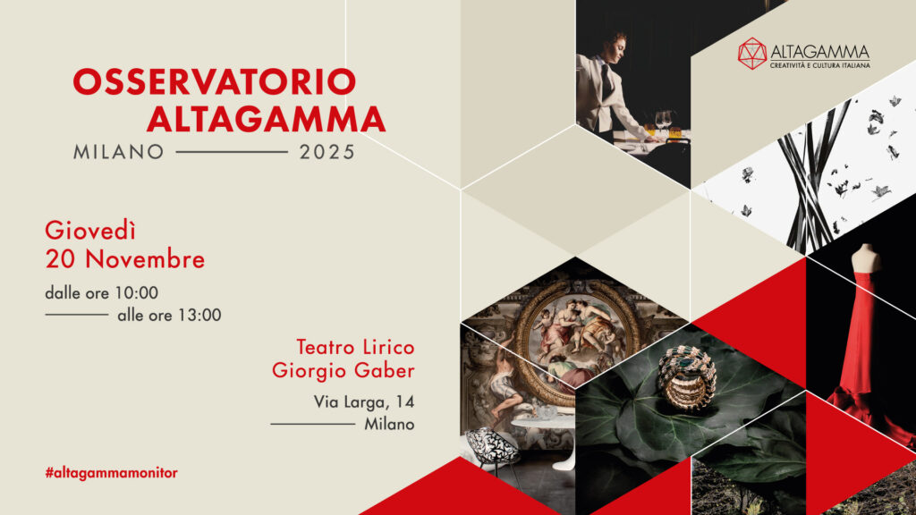 abbiamo il piacere di invitarvi all’Osservatorio Altagamma 2025 che si svolgerà giovedì 20 novembre (10:00 – 13:00) al Teatro Lirico Giorgio Gaber, Via Larga 14 a Milano.