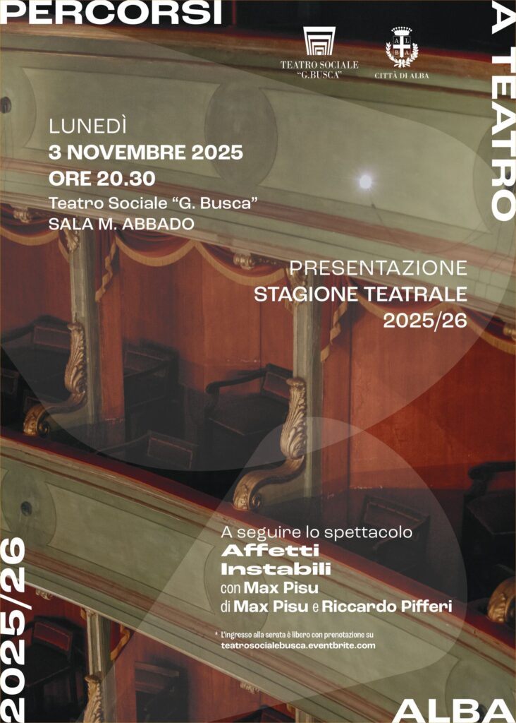 Lunedì 3 novembre, alle ore 20:30, nella sala “Michelangelo Abbado” del Teatro Sociale “G. Busca” di Alba, l’Assessorato alla Cultura del Comune di Alba presenterà al pubblico e alla stampa la 28ª stagione teatrale: una stagione imperdibile, con attori e attrici di fama e talento pronti a emozionare il pubblico.
