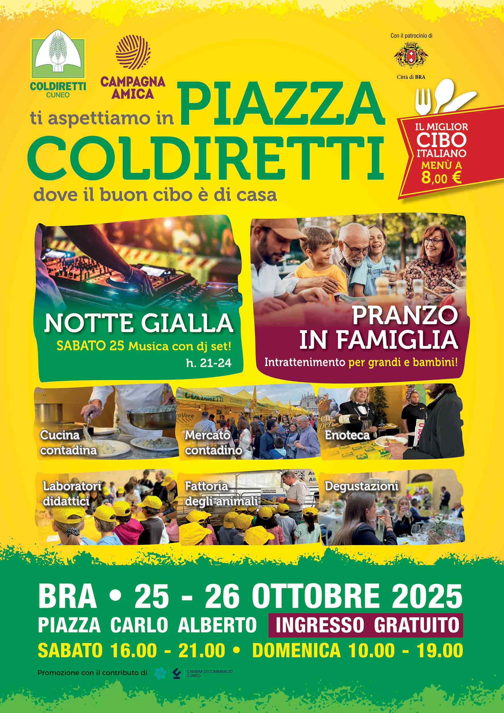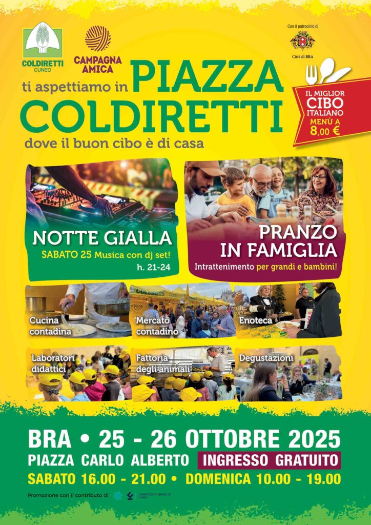 Un weekend all’insegna del gusto, della tradizione e del divertimento: il 25 e 26 ottobre Bra si tinge di “giallo Coldiretti” con Piazza Coldiretti, dove il buon cibo è di casa, il primo festival di Coldiretti Cuneo pensato per far conoscere le eccellenze agricole del territorio e vivere insieme momenti di convivialità.