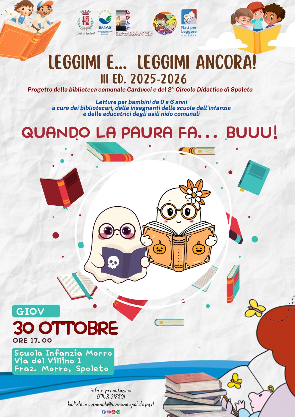 “Quando la paura fa… buuu!” è il terzo appuntamento del Progetto Leggimi e… leggimi ancora! che si terrà giovedì 30 ottobre alle ore 17.00 presso la scuola dell’infanzia Morro, in via del Villino 1.