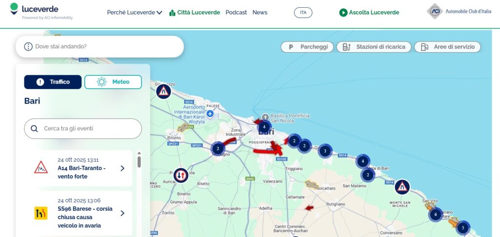 Nello specifico, i servizi “Luceverde infomobilità Bari” includono l’utilizzo di una specifica piattaforma tecnologica messa a disposizione da ACI, idonea alla gestione di eventi riguardanti la viabilità, sia statici che dinamici, utilizzata dal personale della Polizia Locale per acquisire e aggregare le informazioni relative alla mobilità dell’area comunale, raccolte direttamente dagli operatori presenti sul territorio o attraverso i sistemi di rilevazione e i collegamenti di cui dispone il Corpo. In accordo con il Comando di Bari, si prevede il coinvolgimento ulteriore delle Polizie Locali dei Comuni limitrofi, in modo da implementare le informazioni ed estendere il servizio a un bacino di riferimento della Città Metropolitana di Bari.