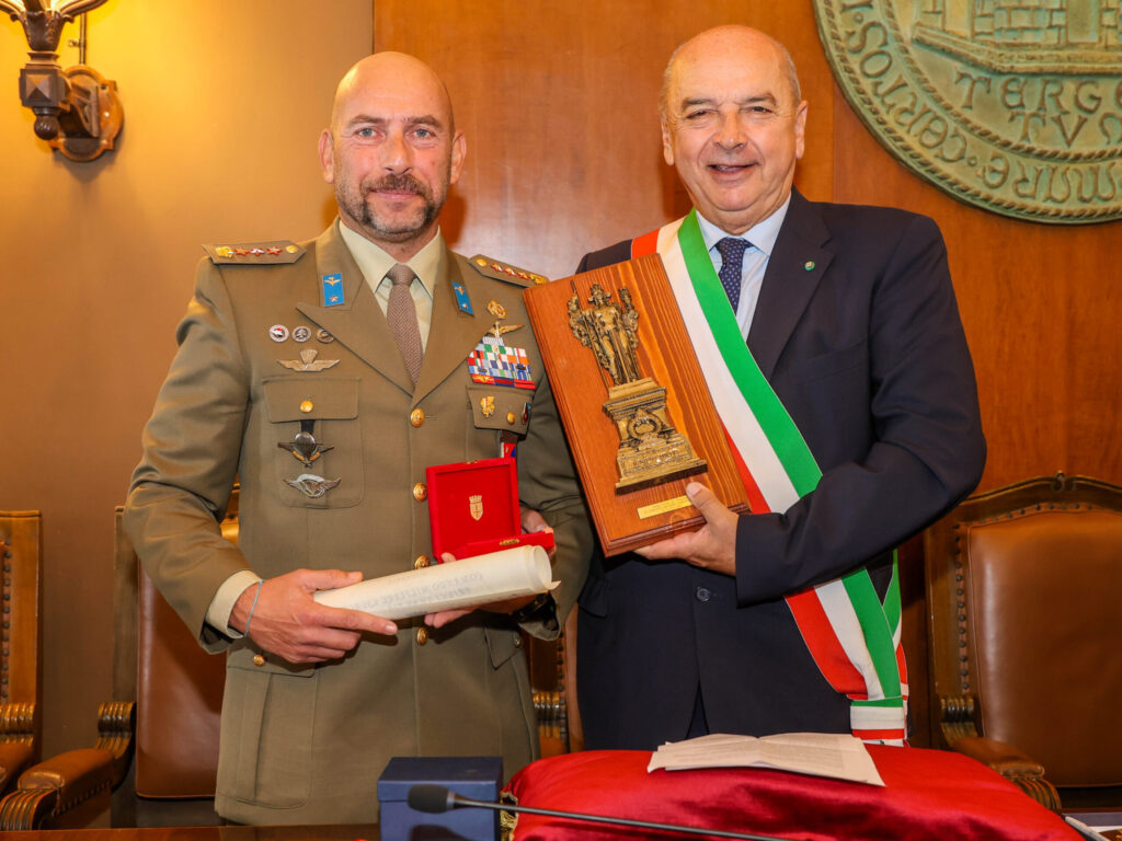 Il Primo cittadino ha consegnato la pergamena, la medaglia di Civica Benemerenza al Comandante Militare Esercito Friuli-Venezia Giulia, colonnello Giuliano Innecco.