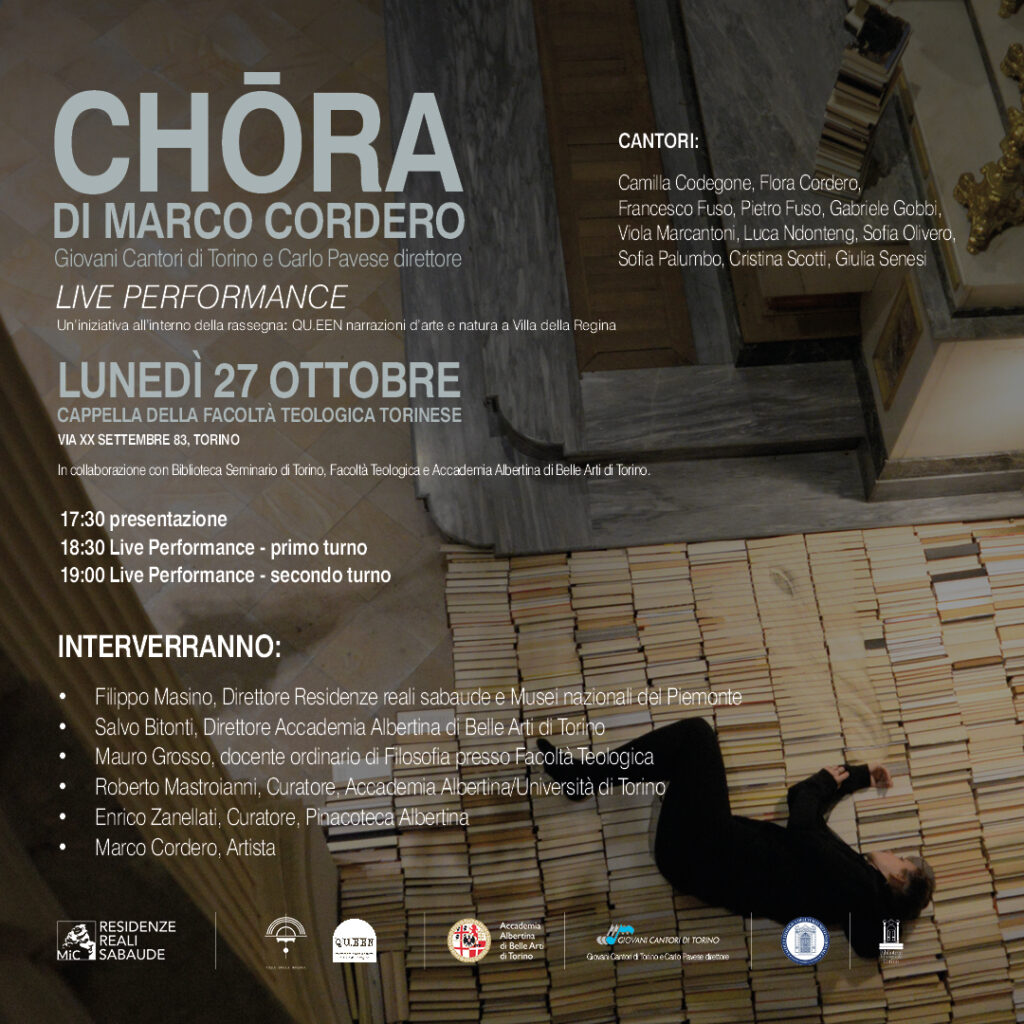 CHŌRA è una live performance che intreccia voce, linguaggio e spazio, realizzata da Marco Cordero con i Giovani Cantori di Torino e Carlo Pavese direttore, in collaborazione con la Biblioteca del Seminario di Torino, Facoltà Teologica, e l’Accademia Albertina di Belle Arti di Torino.