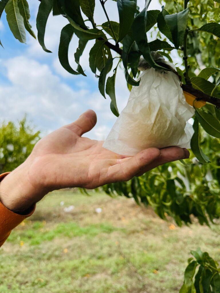 Ogni albero produce generosamente 50 kg circa, ed ogni frutto pesa 200/250 grammi circa. I fiori di pesco sbocciano in primavera, il panorama delle coltivazioni si profuma e l’albero si veste di bellezza. Quando i fiori diventano piccoli frutti, tra maggio e luglio, inizia l’insacchettamento con carta pergamenata che protegge ogni singola piccola pesca lungo il periodo di maturazione da stress patogeni e atmosferici che potrebbero danneggiare il frutto durante la crescita. L’uso del sacchetto consente ai peschicoltori di non ricorrere ad ulteriori pesticidi, proteggendo naturalmente il frutto dalla polpa gialla o bianca che raggiunge un ottimo calibro (circa AA-AAA) sfoggiando una qualità estetica straordinaria nel pieno rispetto della biodiversità, dell’identità territoriale e della sostenibilità ambientale. Il sole riesce comunque a filtrare accarezzando la vellutata buccia che in piena maturazione si colora di bianco, giallo e rosso.