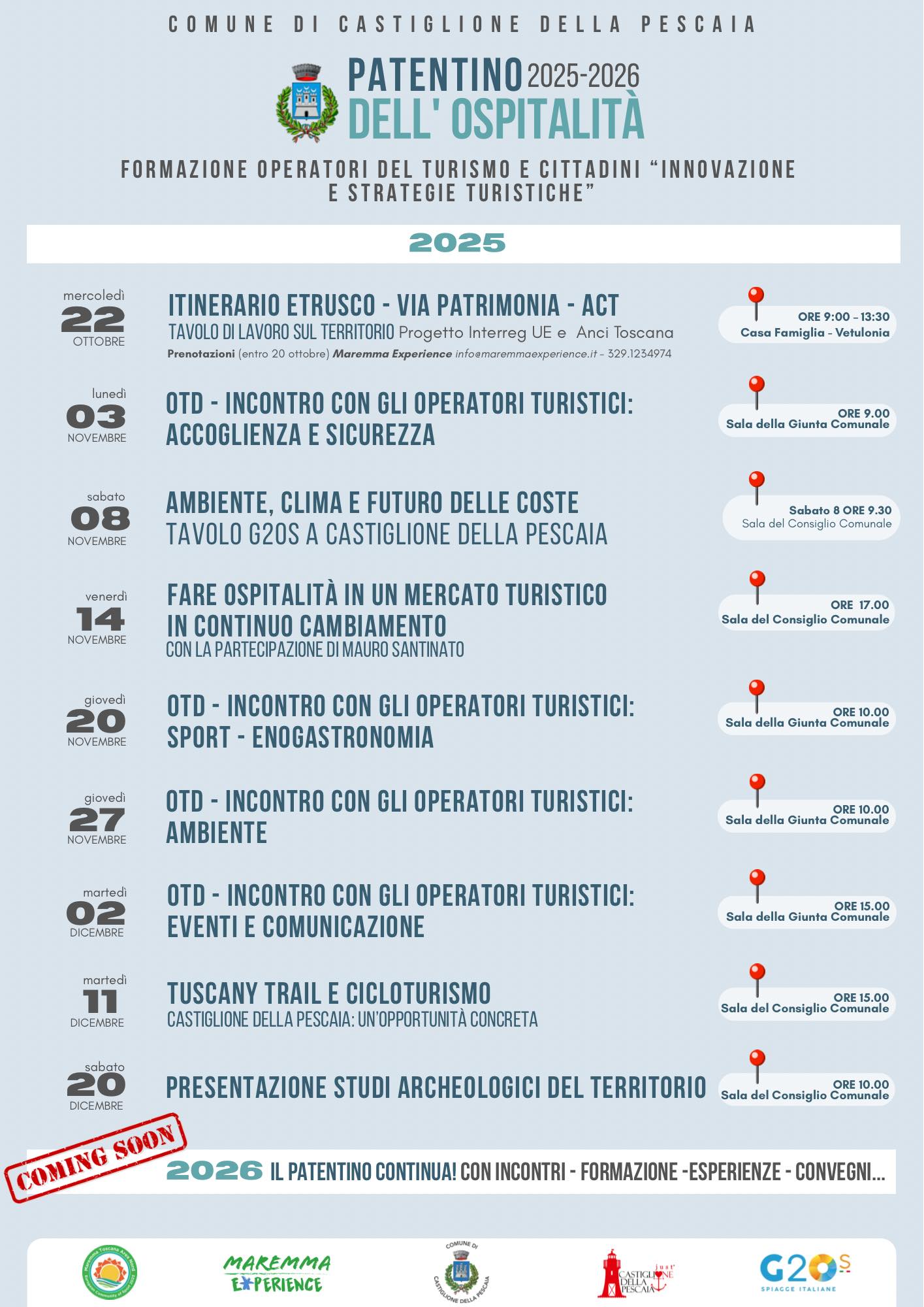Torna con un nuovo ciclo di appuntamenti il Patentino dell’Ospitalità, il percorso formativo e informativo pensato dal Comune di Castiglione della Pescaia per condividere esperienze, sviluppare competenze e rafforzare la cultura dell’accoglienza attraverso incontri, tavoli di lavoro e momenti di confronto aperti a tutti.