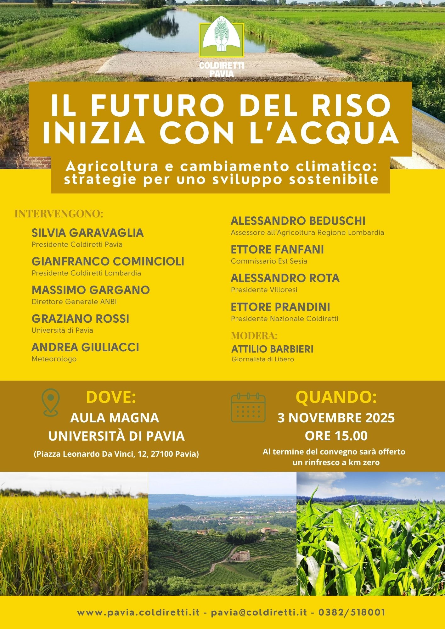 Sarà l’occasione per discutere delle strategie di adattamento ai cambiamenti climatici, con la possibilità di ascoltare i massimi esperti in materia e i rappresentanti delle più importanti Istituzioni del territorio. Al convegno organizzato da Coldiretti Pavia parteciperanno ospiti di altissimo rilievo, a partire dal Presidente Nazionale di Coldiretti Ettore Prandini che discuterà insieme a Silvia Garavaglia (Presidente Coldiretti Pavia), Gianfranco Comincioli (Presidente Coldiretti Lombardia), Alessandro Beduschi (Assessore all’Agricoltura Regione Lombardia), Massimo Gargano (Direttore Generale ANBI), Ettore Fanfani (Commissario Est Sesia), Alessandro Rota (Presidente Villoresi), Graziano Rossi (Università di Pavia) e il meteorologo Andrea Giuliacci.