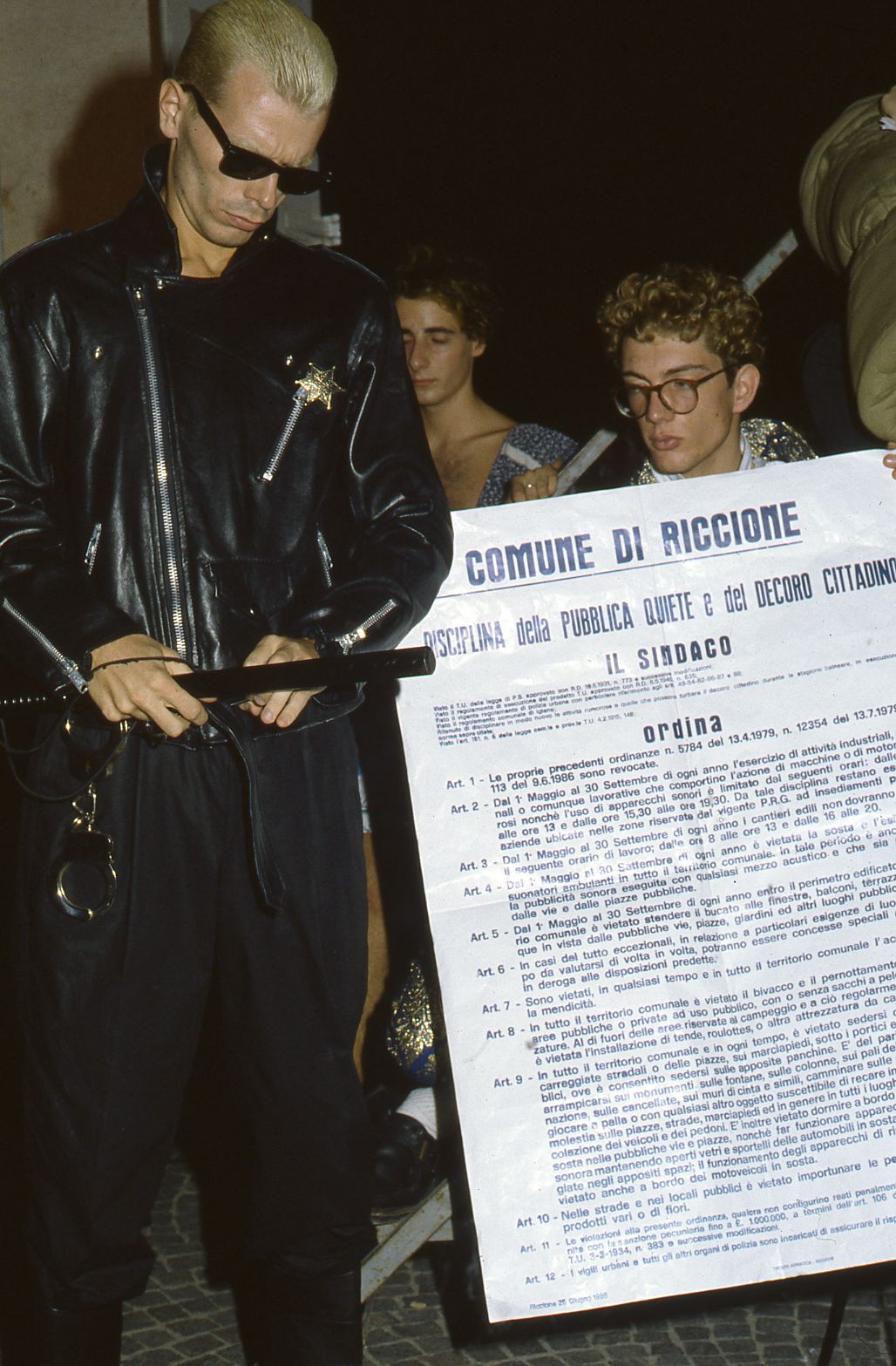 (AGENPARL) - Roma, 28 Ottobre 2025(AGENPARL) – Tue 28 October 2025 sfilata Sacco a pelo Trendy Defilé a Riccione, in Piazzale Roma, 11 agosto 1986, a cura di Patti Bordoni e Enrico Castelli per ARCI – ONU (foto PARITANI). Un modello mostra la cosiddetta ordinanza “anti-saccopelisti”, emanata dall’allora Sindaco di Riccione Terzo Pierani