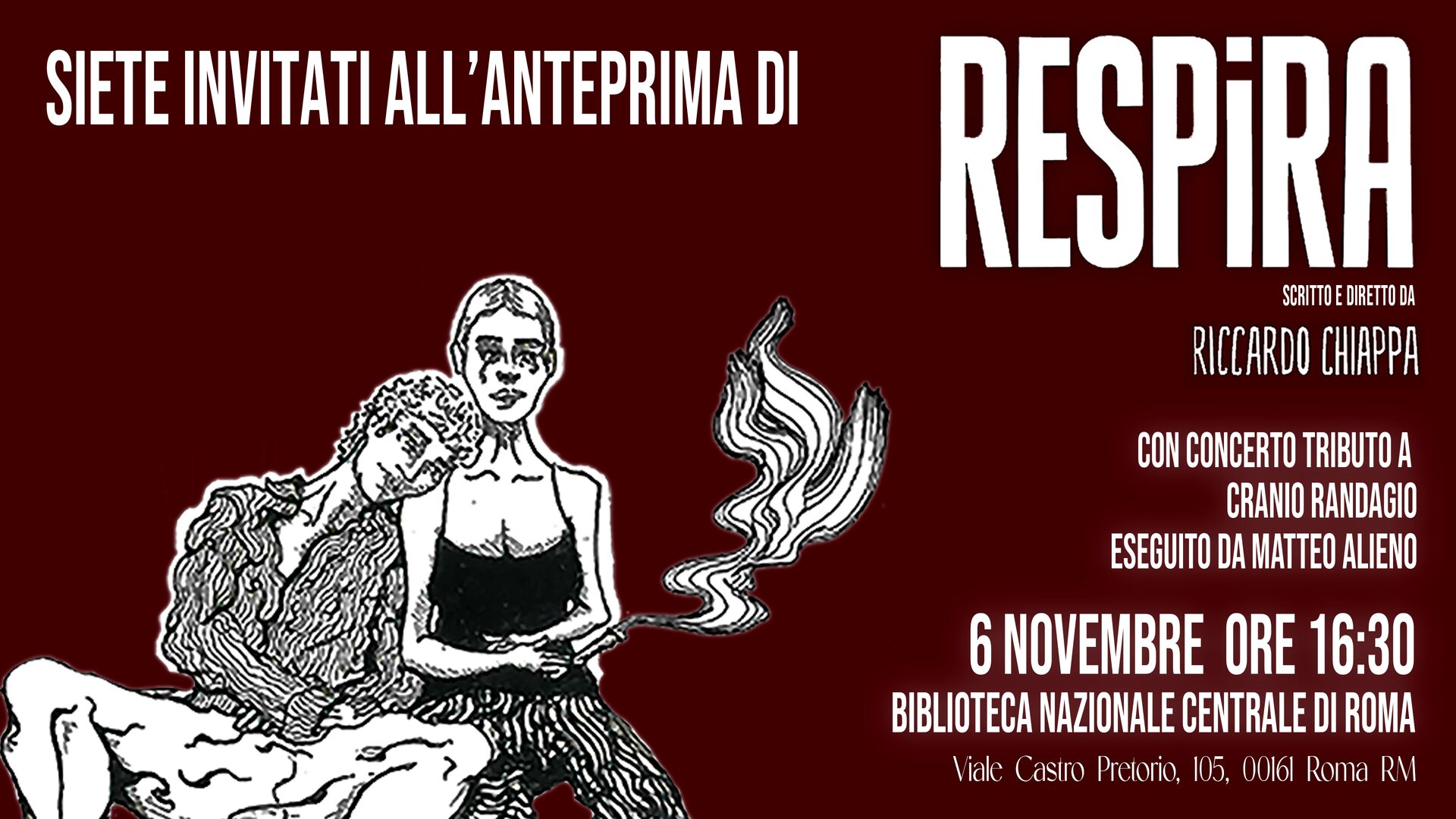 (AGENPARL) - Roma, 29 Ottobre 2025Una giornata dedicata al cinema, ai giovani e alla musica animerà l’Auditorium della Biblioteca nazionale centrale di Roma, con l’anteprima del cortometraggio Respira di Roberto Chiappa e un concerto tributo in memoria di Cranio Randagio (nome d’arte di Vittorio Andrei), il talentuoso rapper romano scomparso, autore del brano “Vittorio come va?”, parte della colonna sonora del corto.