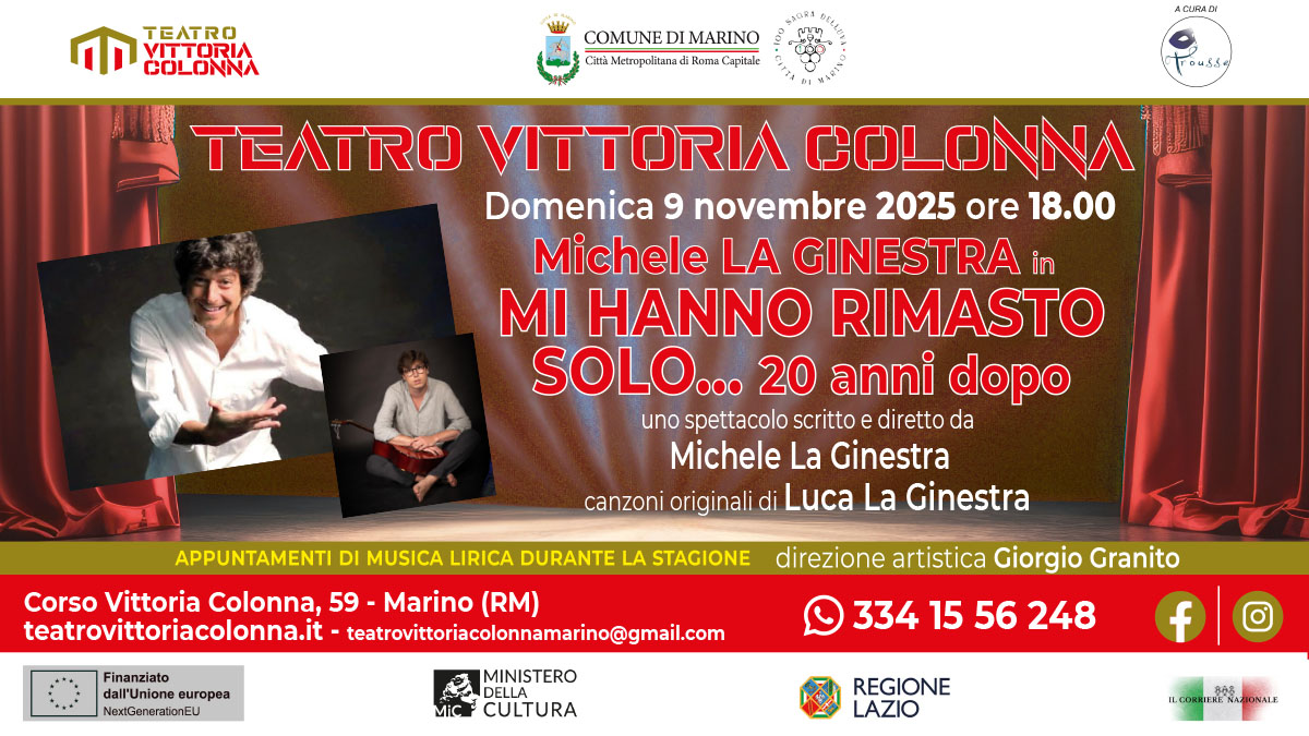 Domenica 9 novembre 2025 alle ore 18,00 andrà in scena al Teatro Vittoria Colonna di Marino lo spettacolo scritto e diretto da Michele La Ginestra dal titolo “Mi hanno rimasto solo … 20 anni dopo”” con la partecipazione di Luca La Ginestra, autore delle canzoni originali.
