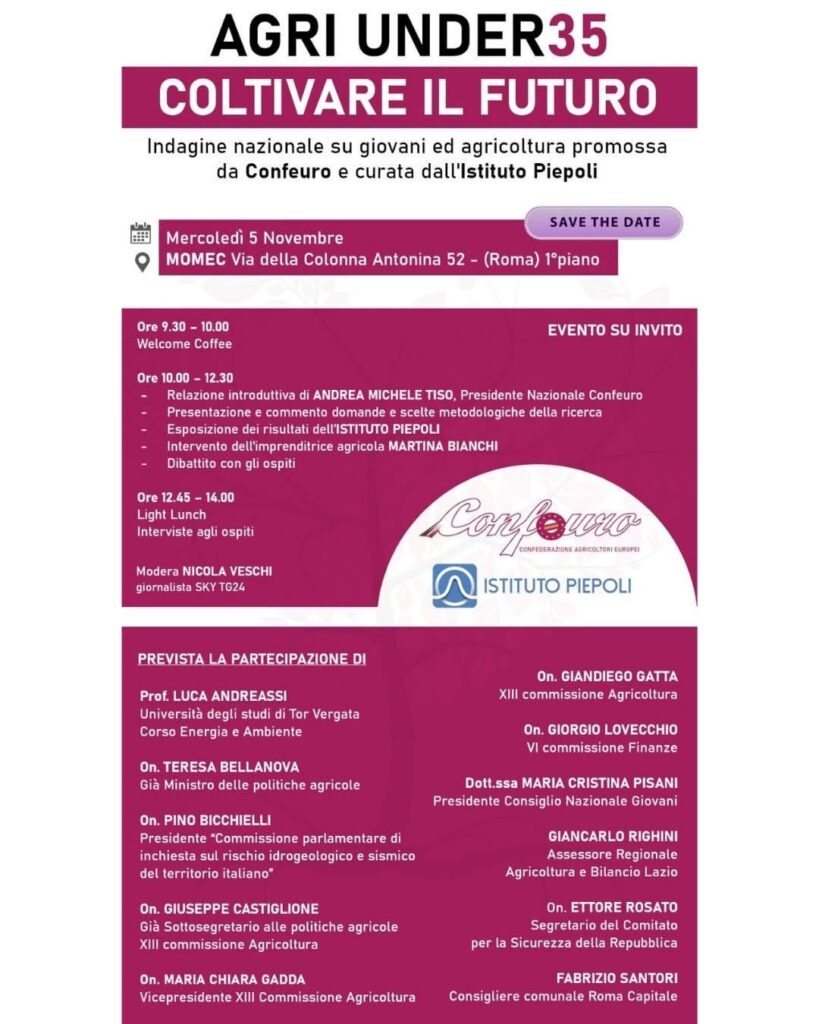 (AGENPARL) - Roma, 3 Novembre 2025“È tutto pronto a Roma per la conferenza di presentazione di “Agri Under 35 – Coltiviamo il futuro”, l’indagine nazionale realizzata per Confeuro, la Confederazione degli Agricoltori Europei, presieduta da Andrea Tiso, sui giovani italiani e volta a comprendere le loro opinioni sull’alimentazione e la loro percezione del futuro dell’agricoltura e del cibo artificiale. L’indagine in particolare ha coinvolto giovani tra i 18 e i 35 anni, con quote proporzionali per genere, fasce d’età, grandi ripartizioni geografiche e ampiezza del comune di residenza. Il Report Confeuro/ Piepoli verrà presentato a partire dalle ore 10 il prossimo mercoledì 5 novembre al Momec, in via della Colonna Antonina 52 a Roma, alla vigilia della Giornata nazionale della Agricoltura che quest’anno si celebrerà domenica 9 novembre. Alla conferenza di presentazione (a numero chiuso e su invito) saranno presenti: Andrea Tiso, presidente nazionale Confeuro, Attilio Arbia, responsabile Confeuro Giovani, e Martina Bianchi, imprenditrice agricola. Modera Nicola Veschi, giornalista di Sky Tg24. All’incontro, inoltre, è prevista la partecipazione di autorevoli esponenti politici e autorità istituzionali: Luca Andreassi, docente dell’Università degli studi di Tor Vergata – Corso Energia e Ambiente; Teresa Bellanova, già ministro delle politiche agricole; gli onorevoli parlamentari Pino Bicchielli, Giuseppe Castiglione, Maria Chiara Gadda, Giandiego Gatta, Giorgio Lovecchio ed Ettore Rosato; Maria Cristina Pisani, Presidente del Cng- Consiglio Nazionale Giovani; Giancarlo Righini, assessore Agricoltura e Bilancio Regione Lazio; e Fabrizio Santori, consigliere comunale di Roma capitale. La stampa è invitata a partecipare. “Abbiamo commissionato all’Istituto Piepoli questa importante indagine dedicata al rapporto tra giovani e agricoltura, con l’obiettivo di analizzare valori, aspettative e sfide delle nuove generazioni che scelgono la terra come futuro. Un’iniziativa – ha anticipato il presidente nazionale Confeuro, Andrea Tiso – che conferma il nostro impegno per un’agricoltura sempre più giovane, sostenibile e protagonista del cambiamento. Ne parleremo tutto insieme il 5 novembre: sarà un grande momento di confronto e dialogo sul presente e sul futuro del comparto primario e del suo ricambio generazionale”.