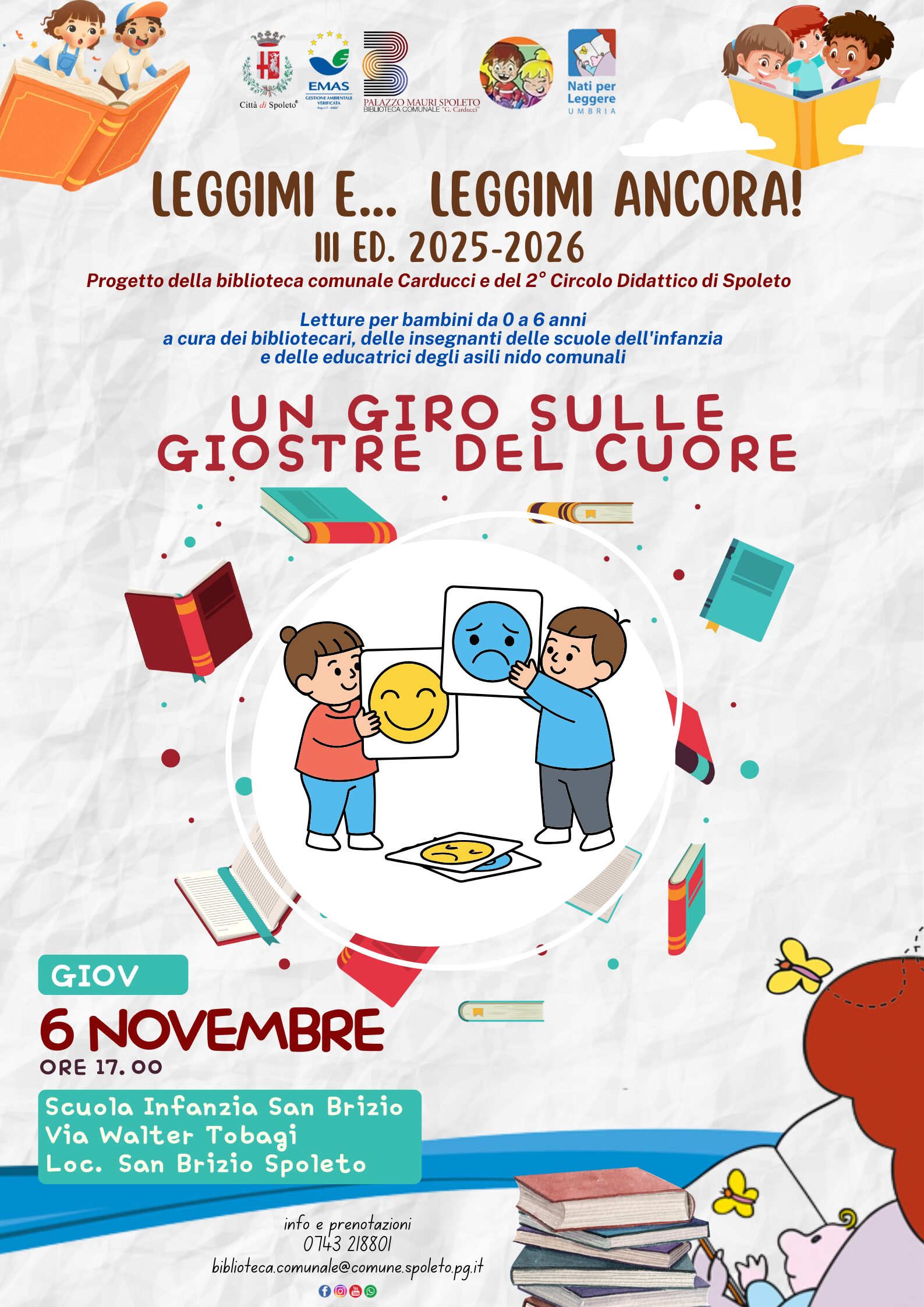 “Leggimi e… Leggimi ancora!”, giunto alla terza edizione, è un progetto di lettura ad alta voce per la fascia 0-6 anni, organizzato dalla Biblioteca comunale “G. Carducci” e dal 2° Circolo Didattico di Spoleto, partner del Patto locale della lettura e inserito nel Programma Nati per Leggere.