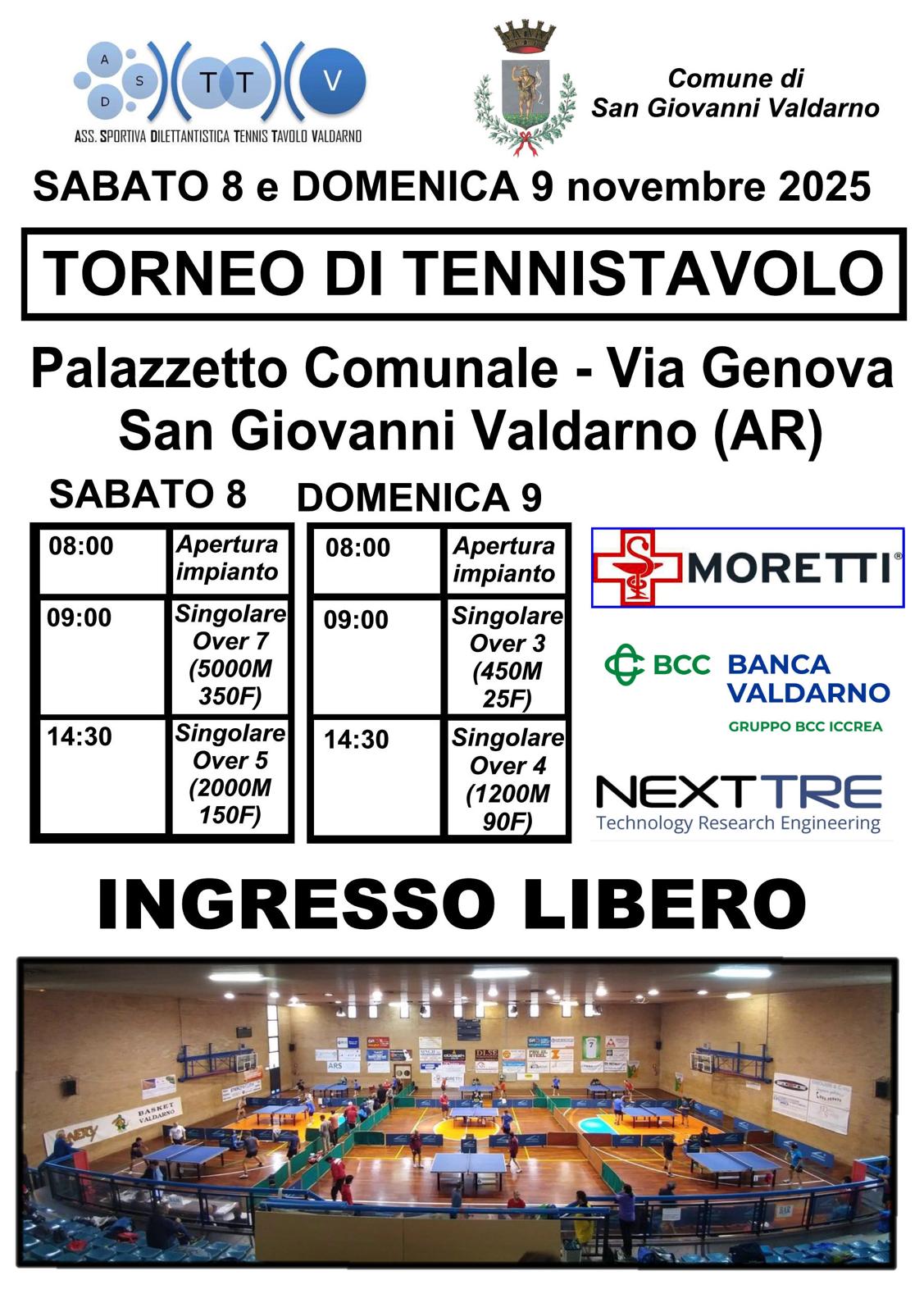Sabato 8 e domenica 9 novembre al palazzetto comunale di via Genova si terrà il torneo organizzato dall’associazione sportiva dilettantistica tennis tavolo Valdarno con il patrocinio del comune di San Giovanni Valdarno.