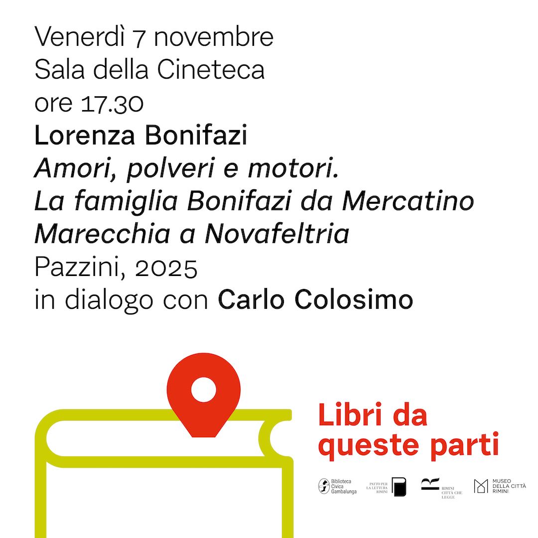 Ci sono libri che nascono da un bisogno intimo: quello di salvare la memoria prima che svanisca.È il caso di “Amori, polveri e motori. La famiglia Bonifazi da Mercatino Marecchia a Novafeltria” (Pazzini Editore, 2025), che Lorenza Bonifazi presenta venerdì 7 novembre alle ore 17.30 nella Sala della Cineteca della Biblioteca Gambalunga di Rimini, nell’ambito della rassegna “Libri da queste parti 2025”. A dialogare con l’autrice sarà lo storico Carlo Colosimo.