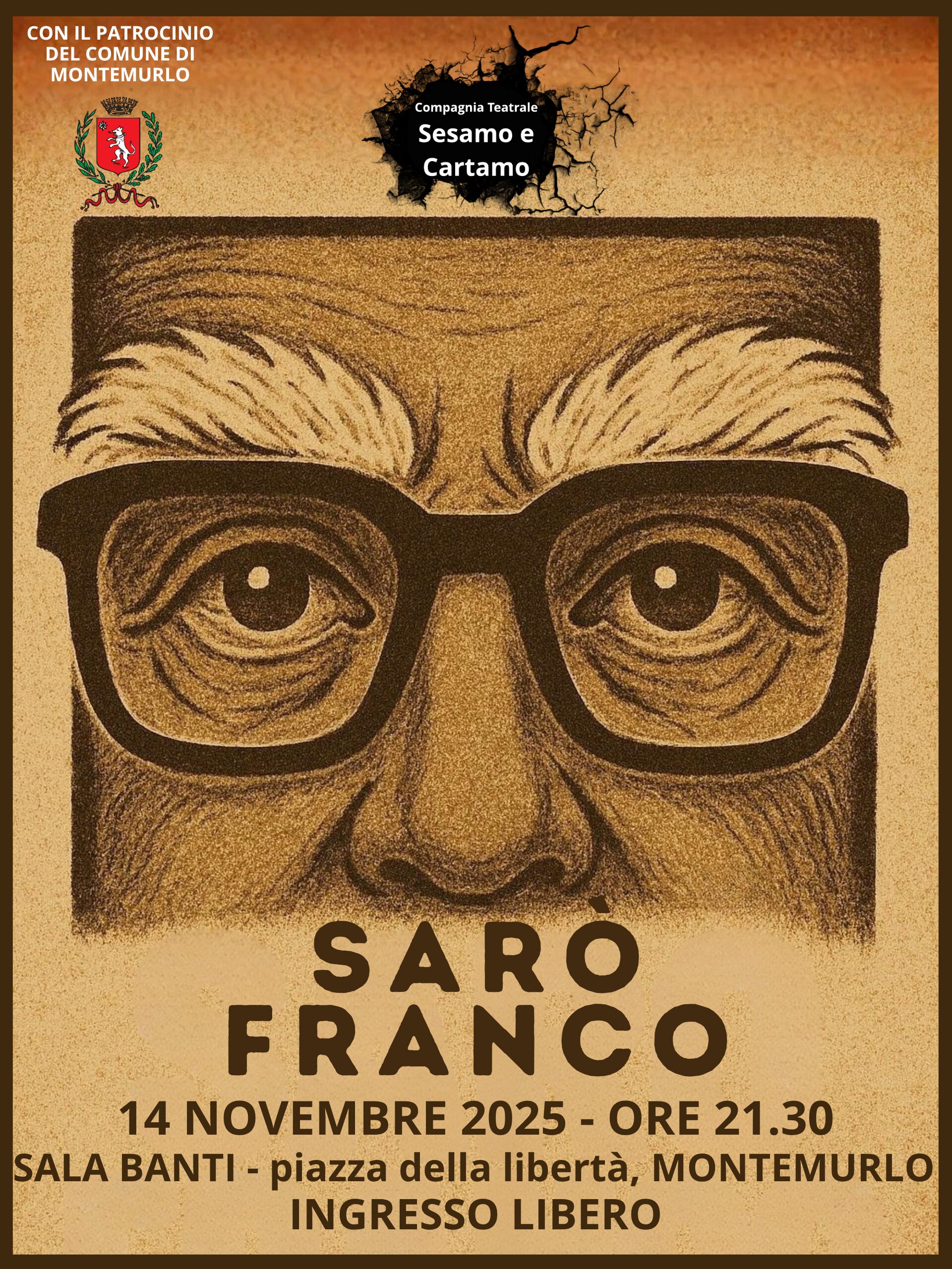 A Montemurlo al teatro della Sala Banti ( piazza della Libertà) venerdì 14 novembre ore 21,15 va in scena “Sarò Franco”, uno spettacolo della Compagnia Sesamo e Cartamo. In “Sarò franco” vedrete un uomo, al centro della scena, su una sedia, in un angolo, di lato, di spalle. È sempre lui, ma non lo è. Sempre uguale, sempre diverso. Sarò franco: tutto ruota attorno a lui: uomini, donne, maghe, trans, medici, critici, suore. Che cosa saprete di loro, che cosa capirete di loro, che cosa porterete a casa di loro? Uscirete sorpresi, sbalorditi, delusi, entusiasti, diversi?. Lo spettacolo ha il patrocinio del Comune di Montemurlo.