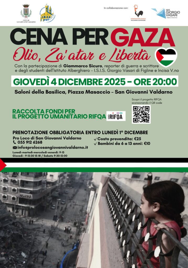 “Abbiamo deciso di iniziare il periodo del Natale a San Giovanni Valdarno con una iniziativa di solidarietà nei confronti del popolo palestinese che vive nella striscia di Gaza e che da anni subisce le aggressioni e le bombe dell’esercito israeliano.” – ha dichiarato il sindaco di San Giovanni Valdarno Valentina Vadi – “Iniziative come questa ci ricordano che la solidarietà non conosce confini e che, anche da una comunità come la nostra, può partire un segnale e contributo concreto per aiutare chi soffre. Ringrazio di cuore l’Associazione Cuochi Valdarno Superiore da cui è partita l’idea di questa cena di solidarietà, l’Istituto Alberghiero Giorgio Vasari di Figline e Incisa Valdarno, il dirigente scolastico, gli studenti e gli insegnanti che parteciperanno attivamente, don Luigi per aver messo a disposizione i saloni della Basilica e Giammarco Sicuro per la disponibilità e la sensibilità dimostrate nel sostenere questa causa”.