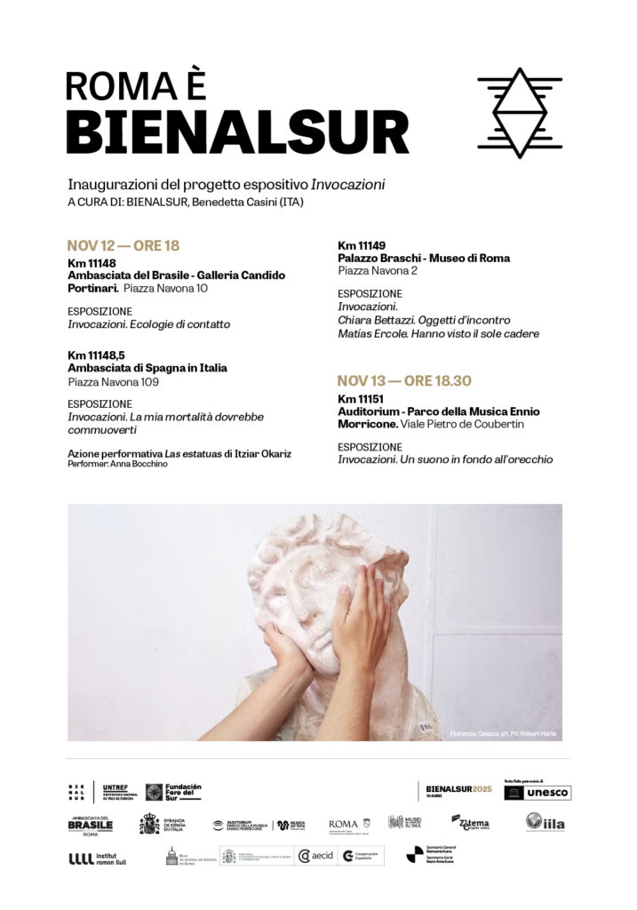 Mercoledì 12 novembre BIENALSUR arriva a Roma inaugurando in contemporanea le mostre presso l’Ambasciata di Spagna in Italia, l’ Ambasciata del Brasile a Roma, il Museo di Roma a Palazzo Braschi, promossa da Roma Capitale, Assessorato alla Cultura, Sovrintendenza Capitolina ai Beni Culturali; mentre Giovedì 13 inaugura l’ultima mostra romana all’Auditorium Parco della Musica Ennio Morricone. Dopo Napoli e Milano BIENALSUR arriva a Roma con il progetto curatoriale diffuso Invocazioni, sviluppato da Benedetta Casini e il cui primo appuntamento ha aperto al pubblico a Milano il 22 ottobre, presso la Fabbrica del Vapore.