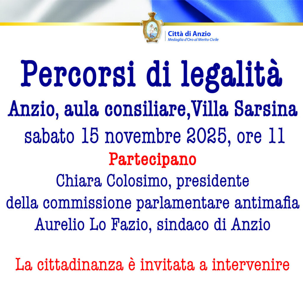 Istituzionale, invece, l’appuntamento di sabato 15 novembre alle 11, con la presidente della commissione parlamentare antimafia, onorevole Chiara Colosimo. Ad accoglierla ci sarà il sindaco di Anzio, Aurelio Lo Fazio.