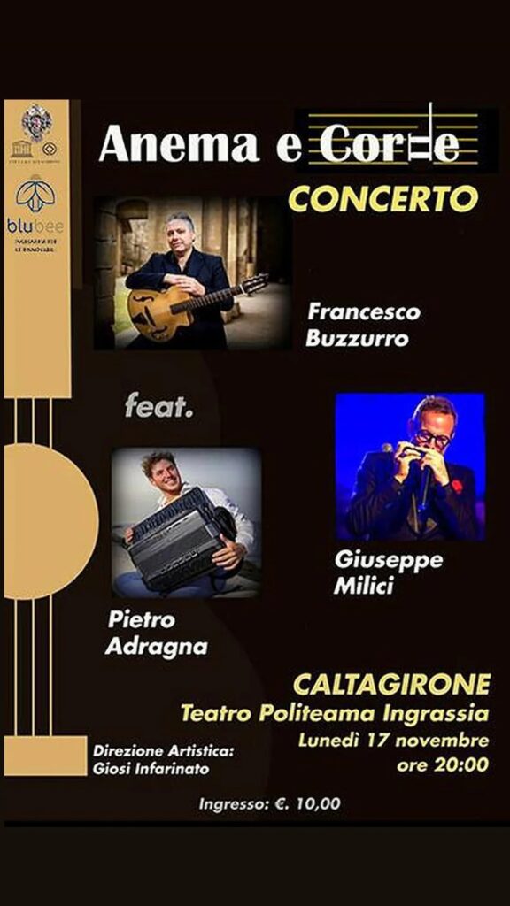 Com. “Anema e Corde”: lunedì 17 novembre, alle 20, al Politeama, concerto del trio con Francesco Buzzurro (chitarrista e compositore), l’armonicista Giuseppe Milici e il fisarmonicista Pietro Adragna
