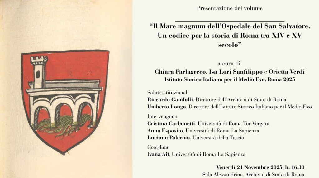 (AGENPARL) - Roma, 17 Novembre 2025Venerdì 21 novembre sarà presentato presso la Sala Alessandrina il volume Il Mare magnum dell’Ospedale del San Salvatore. Un codice per la storia di Roma tra XIV e XV secolo, a cura di Chiara Parlagreco, Isa Lori Sanfilippo, Orietta Verdi ed edito dall’Istituto Storico Italiano per il Medio Evo.