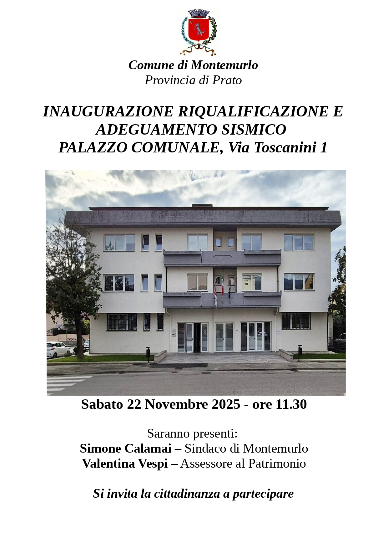 Il Comune di Montemurlo presenta alla cittadinanza i lavori di riqualificazione del palazzo comunale di via Toscanini, 1. L’inaugurazione ufficiale alla presenza del sindaco Simone Calamai e dell’assessore al patrimonio, Valentina Vespi si svolgerà sabato 22 novembre alle ore 11,30. L’edificio, completamente rinnovato, ospita importanti uffici come lo Sportello al cittadino e anagrafe, l’urbanistica, l’edilizia, l’ambiente, il Suap e tutta l’area tecnica e lavori pubblici. Il palazzo è stato reso conforme alle normative antisismiche attuali attraverso l’installazione di “dispersori sismici” (ammortizzatori) tra le fondazioni e i pilastri. Inoltre ne è stata migliorata l’efficienza energetica. I lavori hanno visto ad esempio l’installazione di un “cappotto termico”, la sostituzione degli infissi e la revisione degli impianti di riscaldamento e raffreddamento. « Il palazzo è stato reso più sicuro e maggiormente sostenibile da un punto di vista ambientale- spiega il sindaco Calamai- Attraverso l’inaugurazione ufficiale vogliamo far conoscere gli interventi realizzati alla cittadinanza». L’intervento, del valore complessivo di 1 milione e 250 mila euro, è stato sovvenzionato per 950 mila euro con fondi regionali sulla messa in sicurezza degli edifici pubblici strategici