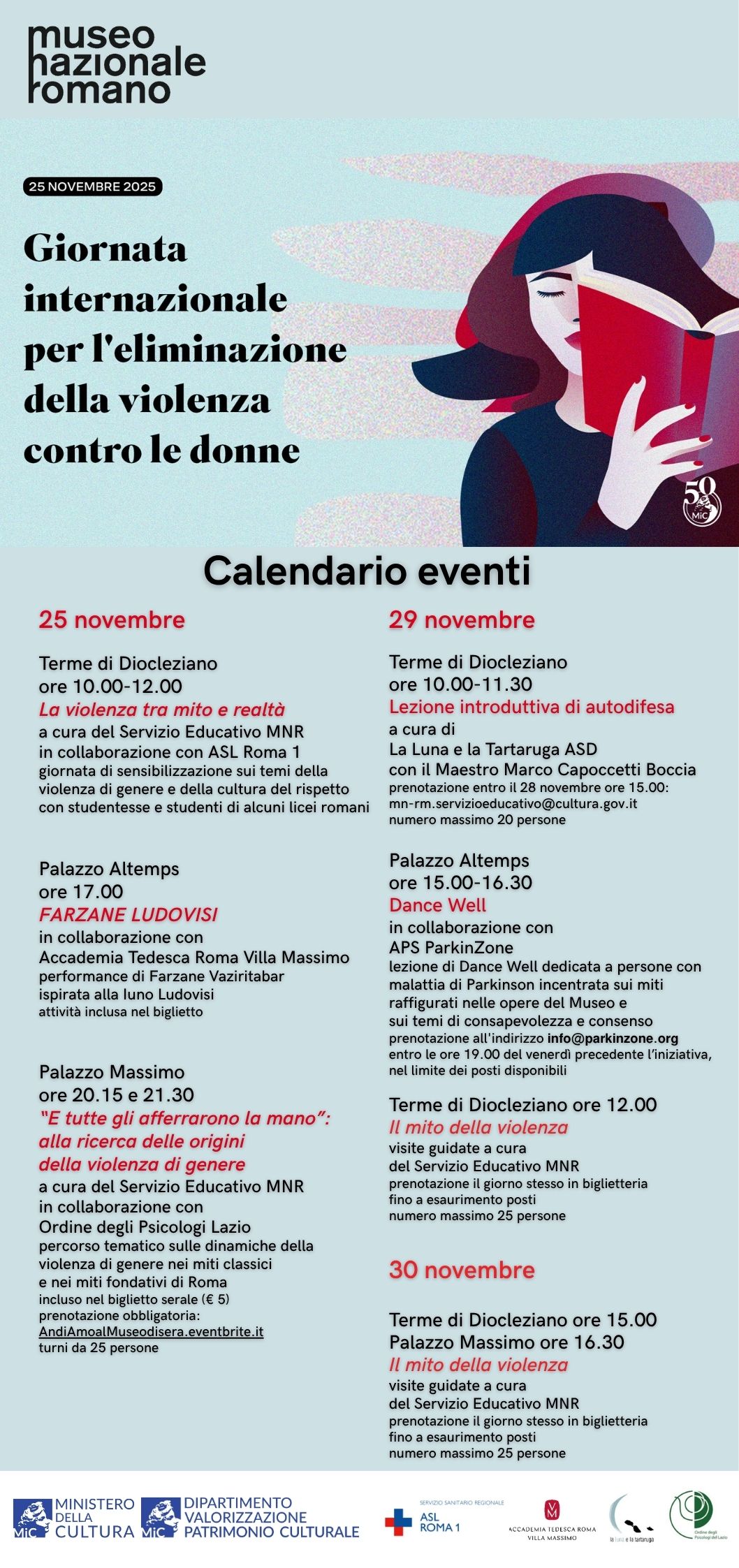 In occasione della Giornata Internazionale per l’Eliminazione della Violenza contro le Donne, istituita dall’Assemblea Generale delle Nazioni Unite nel 1999, il Museo Nazionale Romano promuove e organizza una serie di iniziative per l’intera giornata del 25 novembre e nel weekend successivo.