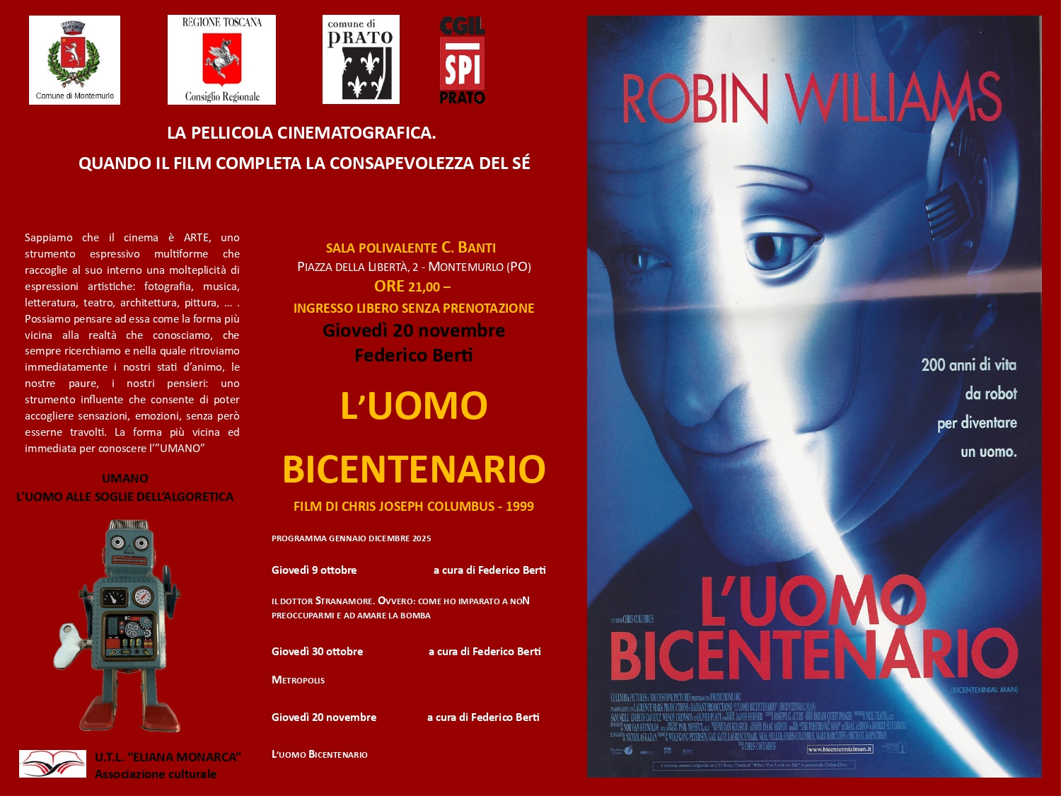 A Montemurlo, per il secondo anno di seguito, torna la rassegna “Umano, l’uomo alle soglie dell’algoretica”, promossa dall’associazione culturale Eliana Monarca con il patrocinio del Comune di Montemurlo e Spi Cgil. Il terzo appuntamento di questa nuova stagione è per giovedì 20 novembre ore 21 teatro della Sala Banti (piazza della Libertà) con la proiezione del film del 1999 diretto da Chris Columbus con Robin Williams . La proiezione del film sarà preceduta dall’introduzione di Federico Berti, giornalista e critico cinematografico. Il cinema è arte e raccoglie al suo interno una varietà di espressioni artistiche: fotografia, musica, pittura, teatro… Possiamo dunque pensare che il cinema possa essere la forma più vicina alla realtà e nella quale ritroviamo i nostri stati d’animo, le nostre paure, i nostri pensieri. La forma più vicina per comprendere l’Umano. L’ingresso alle serate è libero e senza prenotazione.