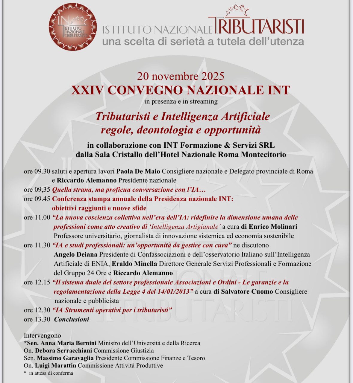 (AGENPARL) - Roma, 19 Novembre 2025Domani giovedì 20 novembre si terrà il XXIV CONVEGNO NAZIONALE dell’Istituto Nazionale Tributaristi (INT) dal titolo “Tributaristi e Intelligenza Artificiale regole, deontologia e opportunità”, in presenza e in streaming dalla Sala Cristallo dell’Hotel Nazionale in Piazza Monte Citorio in Roma. Live sul canale YouTube INT https://www.youtube.com/@istitutonazionaletributa…/streams e sulla pagina facebook dell’Istituto Nazionale Tributaristi https://www.facebook.com/istituto.tributaristi modalità libere ed accessibili a tutti. Per l’ acquisizione di 4 crediti formativi da parte dei tributaristi INT visione esclusivamente su piattaforma digitale zoom come da indicazioni nella newsletter quotidiana. L’apertura dei lavori e i saluti istituzionali saranno a cura di Paola De Maio Consigliere nazionale e Delegato provinciale di Roma e del Presidente Riccardo Alemanno che proseguirà con l’illustrare brevemente una “strana, ma proficua conversazione con l’IA” al termine della quale si terrà la Conferenza stampa della Presidenza nazionale su obiettivi raggiunti e nuove sfide.