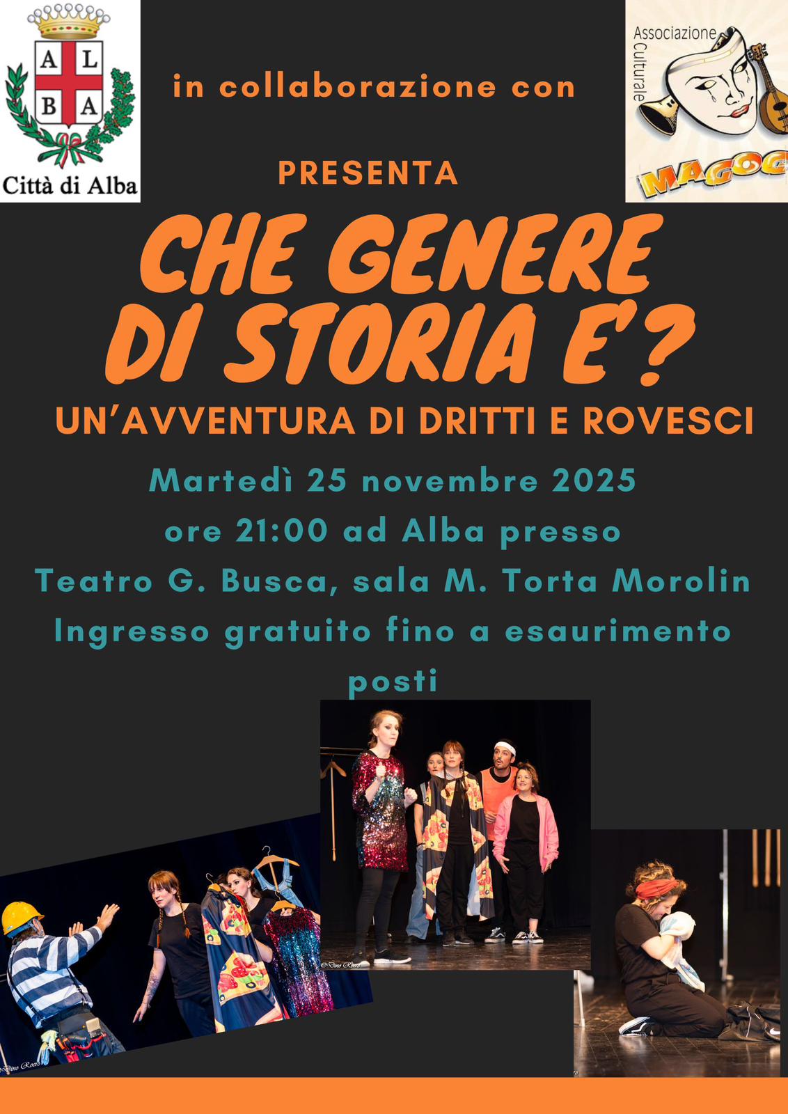 L’Assessorato alle Pari Opportunità e l’Assessorato al Protagonismo giovanile invitano martedì 25 novembre, alle ore 21, nella sala Marianna Torta Morolin del Teatro Sociale G. Busca, allo spettacolo “Che genere di storia è?”, con l’Associazione di Promozione Sociale Magog di Alba.