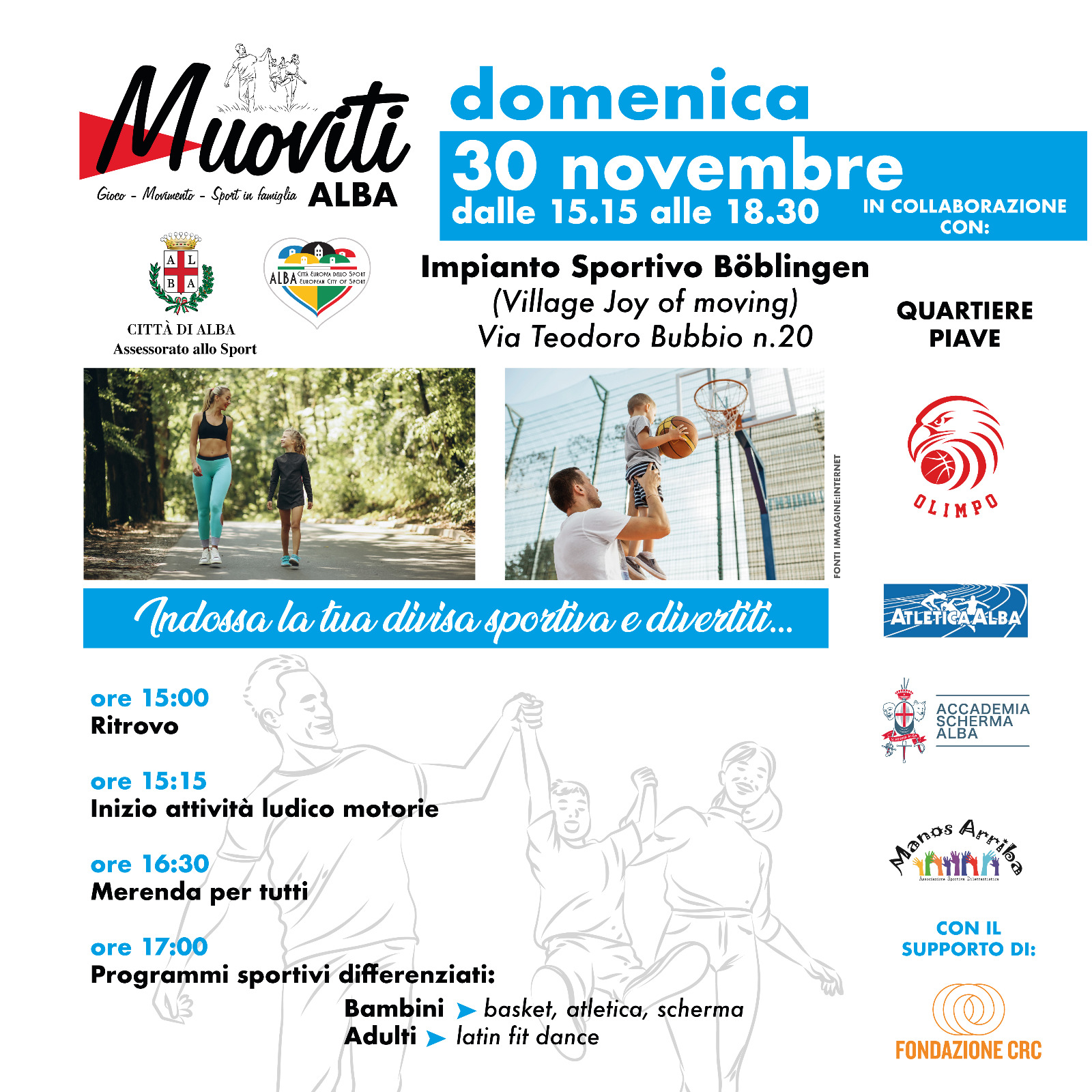 Il prossimo appuntamento è per domenica 30 novembre alle ore 15:00 all’Impianto Sportivo Böblingen (Village Joy of Moving) in via T. Bubbio 20 ad Alba, nel quartiere Piave.