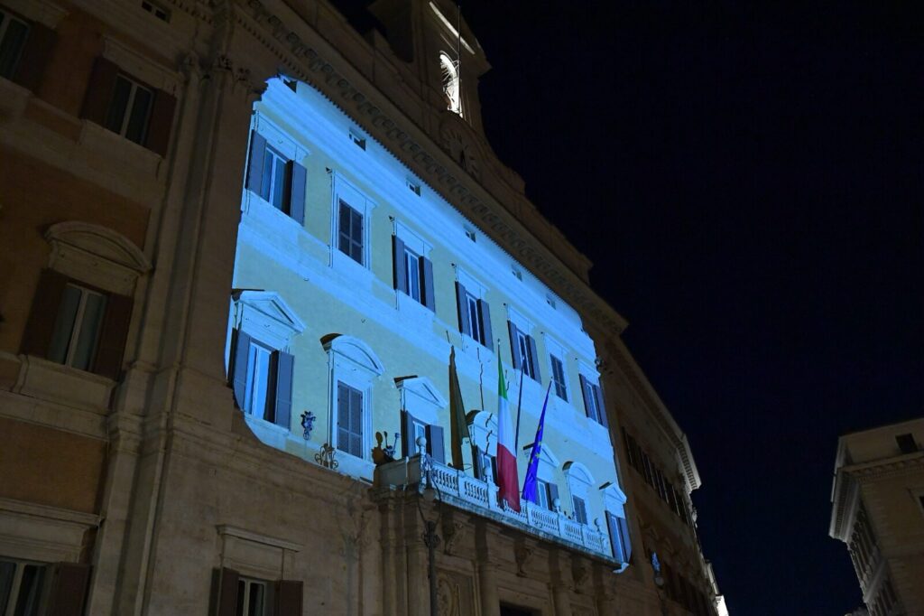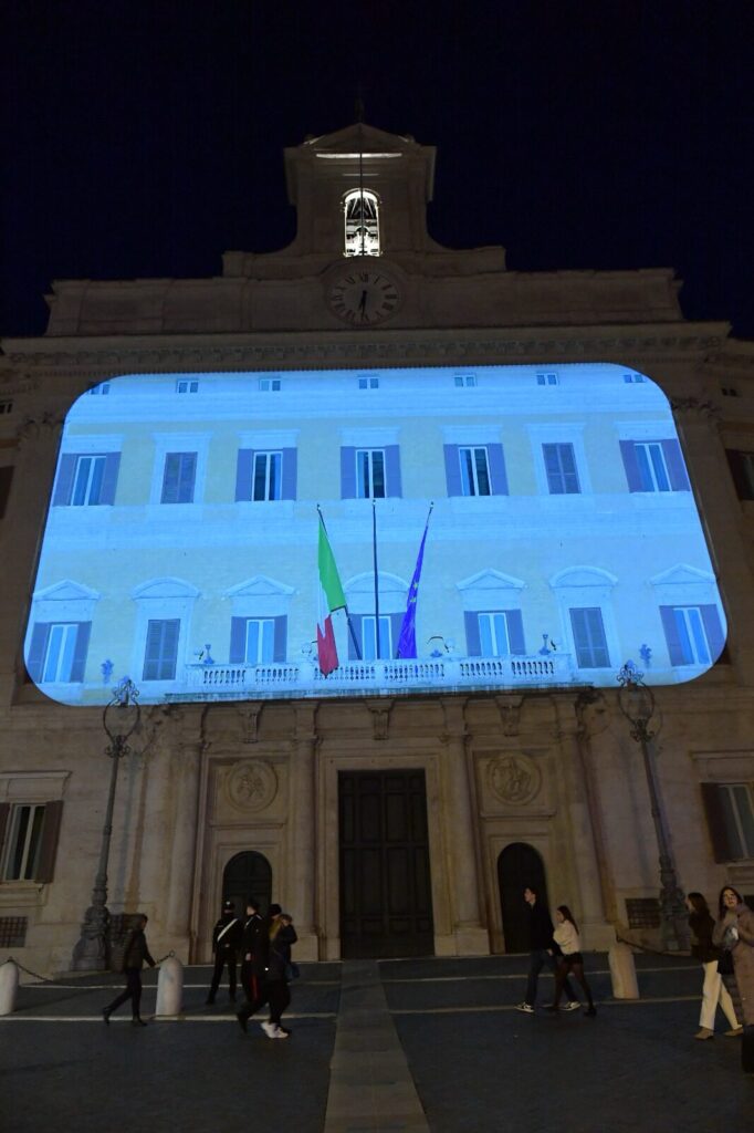 Undicesima edizione della campagna di sensibilizzazione sul cancro del polmone, ‘Illumina novembre 2025’: la facciata di Montecitorio illuminata dal colore bianco intenso, che simboleggia la neoplasia polmonare.