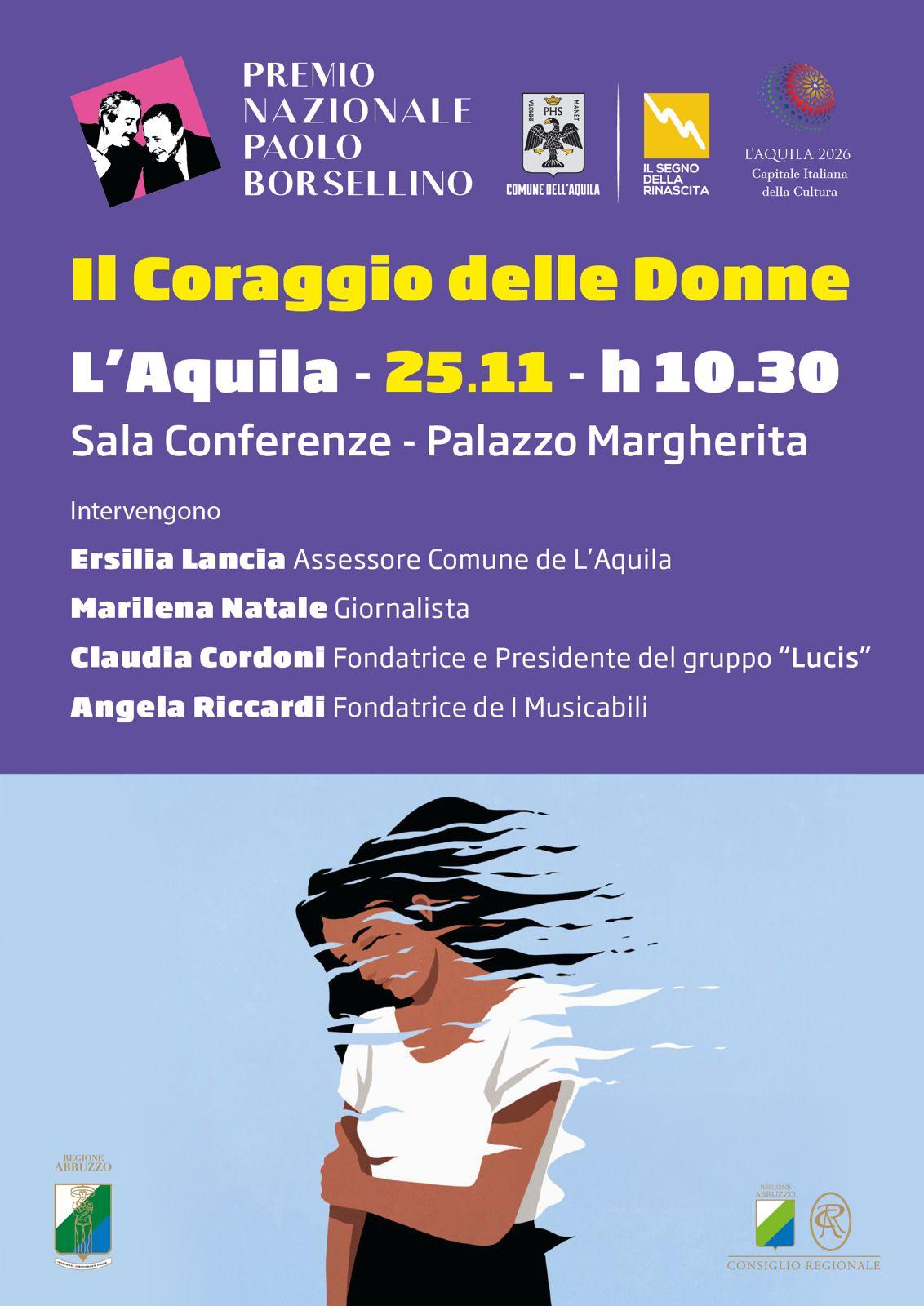 • nella Sala Conferenza di Palazzo Margherita con inizio alle ore 10.30, si terrà una conferenza dal titolo “Il coraggio delle donne”, che è anche l’ultimo appuntamento inserito nell’edizione 2025 del Premio Nazionale Paolo Borsellino. All’incontro interverranno l’Assessore alle Pari Opportunità del Comune dell’Aquila Ersilia Lancia, la giornalista Marilena Natale, la Fondatrice e Presidente dell’associazione di promozione sociale “Lucis” Claudia Cordoni e la Fondatrice della compagnia “I MusicAbili” Angela Riccardi;