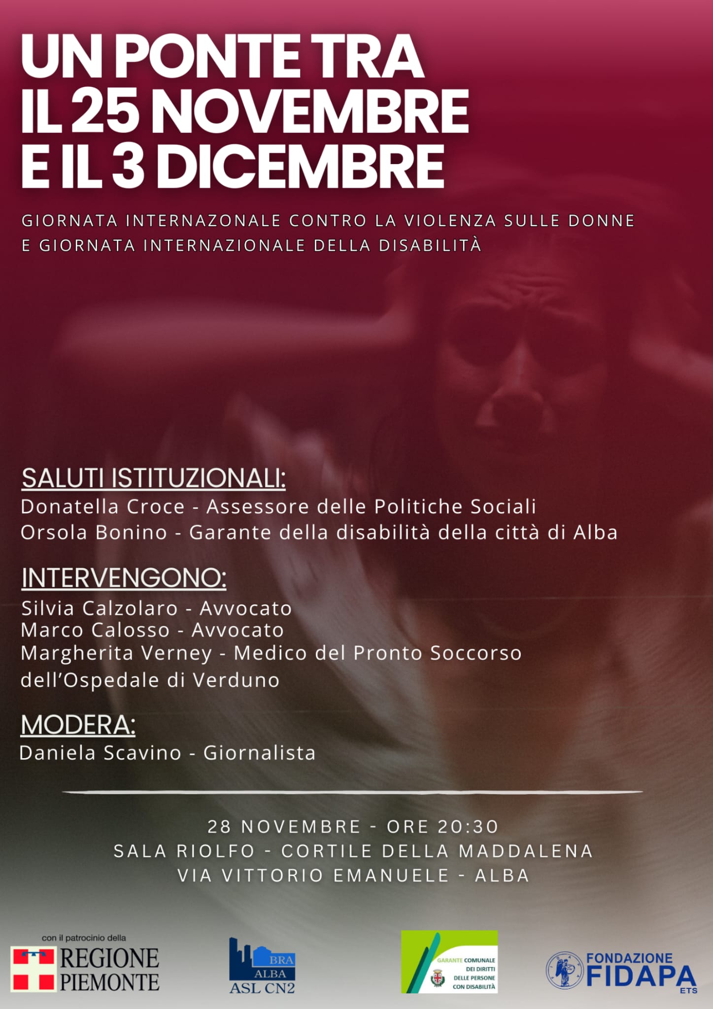 L’incontro dal titolo “Un ponte tra il 25 novembre e il 3 dicembre” intende riflettere sulla Giornata internazionale contro la violenza sulle donne (25 novembre) e la Giornata internazionale delle persone con disabilità (3 dicembre).