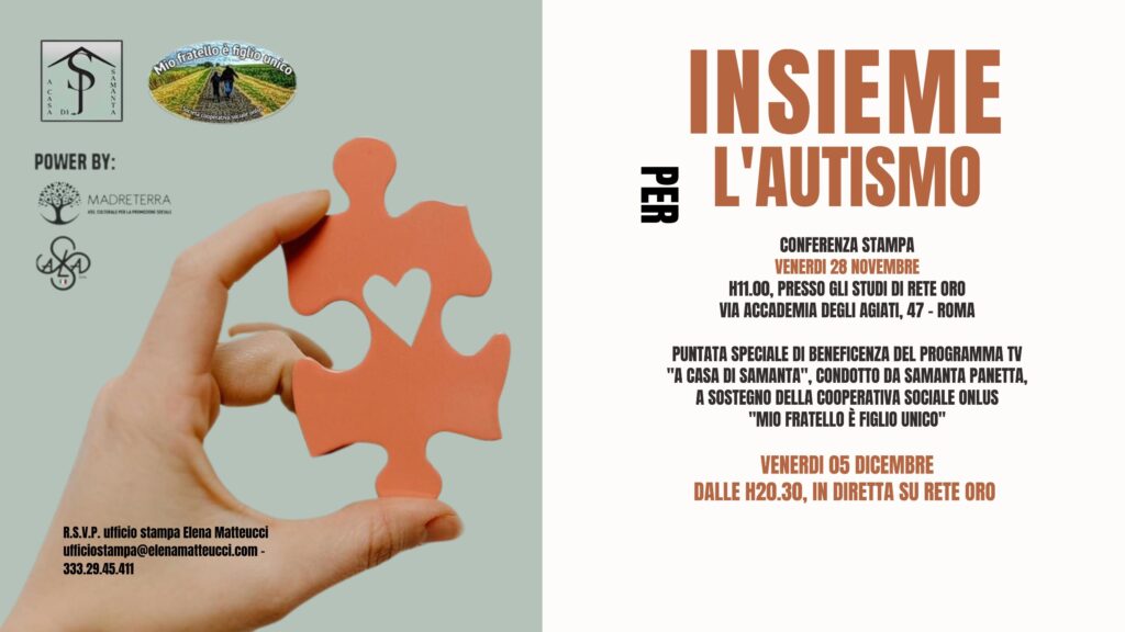 Special Guest: Mago HeldinVenerdì 28 novembre, alle ore 11:00, verrà presentata la Conferenza Stampa a Roma, negli Studi di Rete Oro, per annunciare una serata speciale in onda, in diretta, il prossimo 5 Dicembre ore 20:30, dedicata alla raccolta fondi per l’autismo. Tra gli ospiti che interverranno alla Conferenza Stampa: il Presidente della Cooperativa Onlus “Mio fratello è figlio unico”, Alessandro Carella, la psicomotricista Laura Carella, la conduttrice Samanta Panetta, l’Assessora alle Politiche Sociali del Municipio VIII Alessandra Aluigi, la Presidente di Terziario Donna Confcommercio Roma Simona Petrozzi e il testimonial della serata che incanterà con il suo spettacolo, il Mago Heldin.