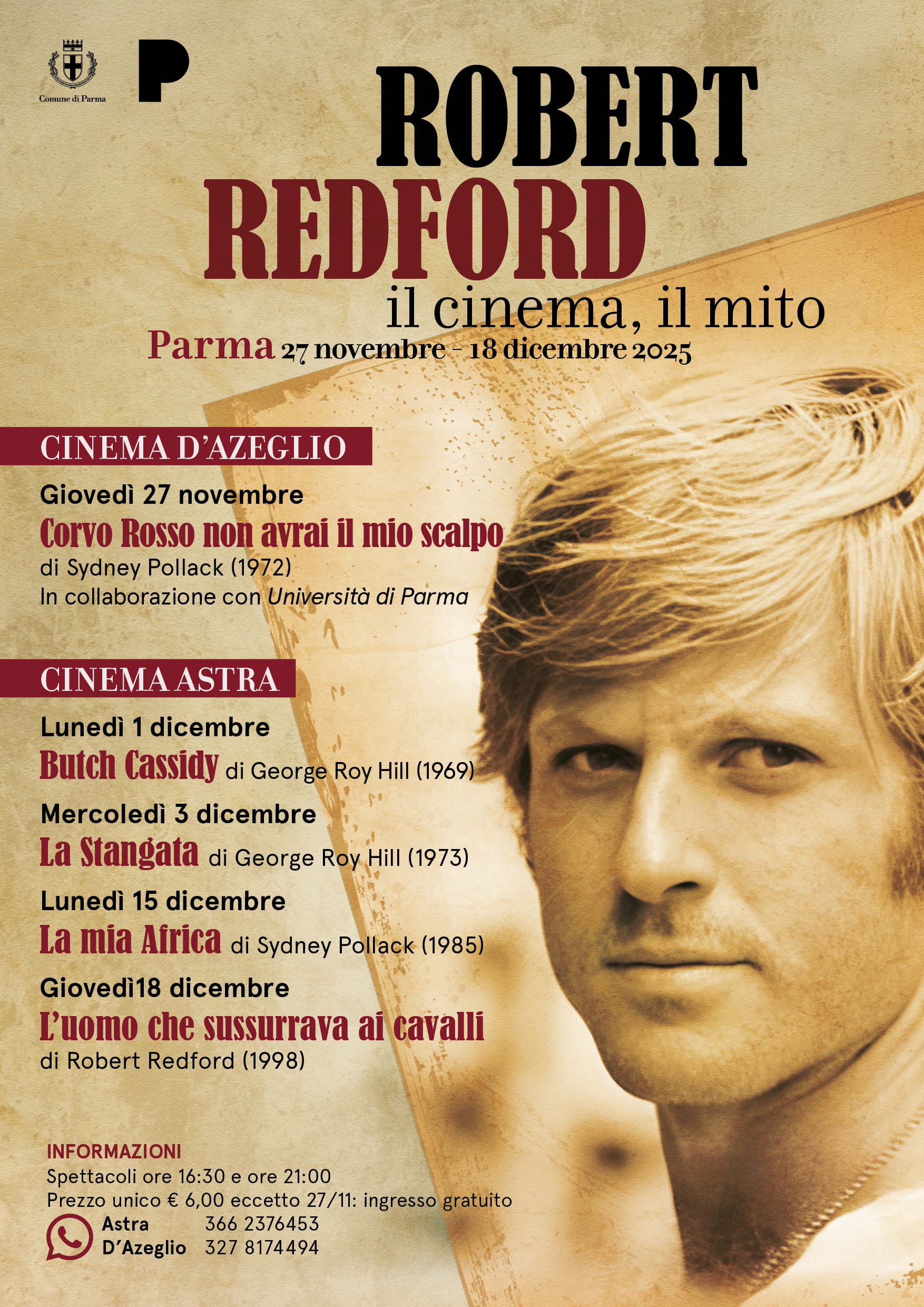 Parma, 28 dicembre 2025. La rassegna cinematografica “Robert Redford. Il cinema, il mito”, in programma dal 1° al 18 dicembre al cinema Astra, celebra il grande attore e regista americano recentemente scomparso. Il pubblico potrà rivivere alcune delle pellicole che hanno segnato la sua carriera e la sua vita, con doppia proiezione, rendendo omaggio a una vera leggenda del cinema e icona dei nostri tempi. L’iniziativa è a cura dell’Ufficio Cinema – Settore Cultura del Comune di Parma.