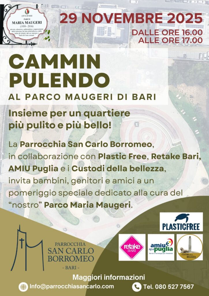 L’iniziativa riunirà a partire dalle ore 16 i volontari delle associazioni Retake Bari, Plastic Free Puglia, Custodi della bellezza, insieme ai cittadini che vorranno liberamente partecipare e in collaborazione con Amiu Puglia, con lo slogan “Per un parco più pulito e più bello”.