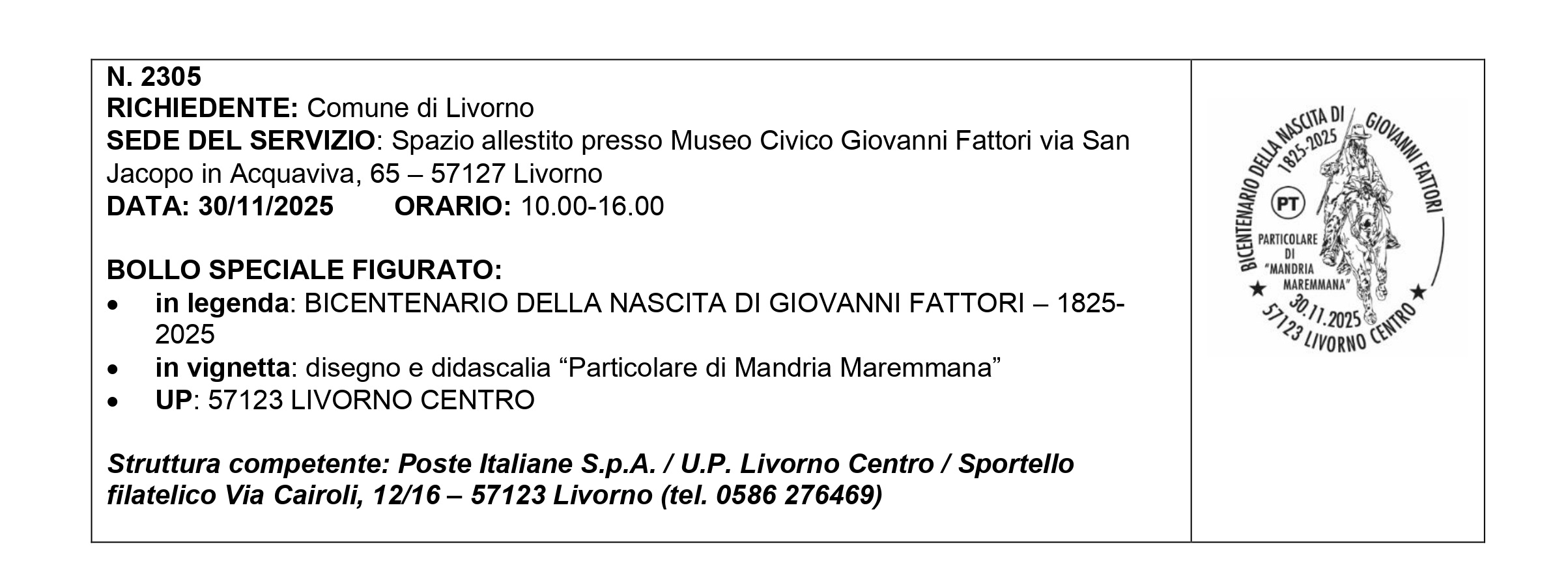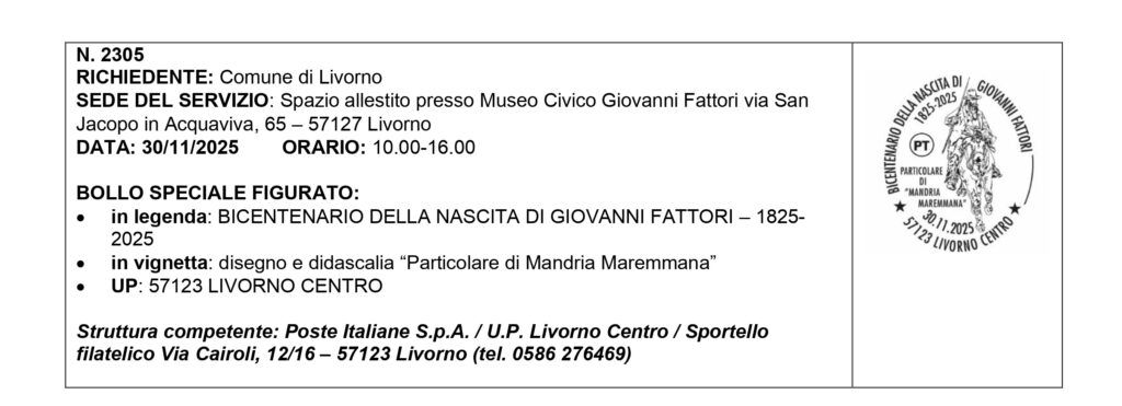Lo speciale timbro (“Bollo speciale figurato”) creato per questa celebrazione riporta in legenda la scritta “Bicentenario della Nascita di Giovanni Fattori 1825-2025” e in vignetta la scritta “Particolare di Mandria Maremmana” che fa da didascalia ad un disegno ispirato all’omonimo dipinto. Le informazioni sull’annullo sono riportate al n. 2305 del Calendario Marconista n. 85 di Poste Italiane.