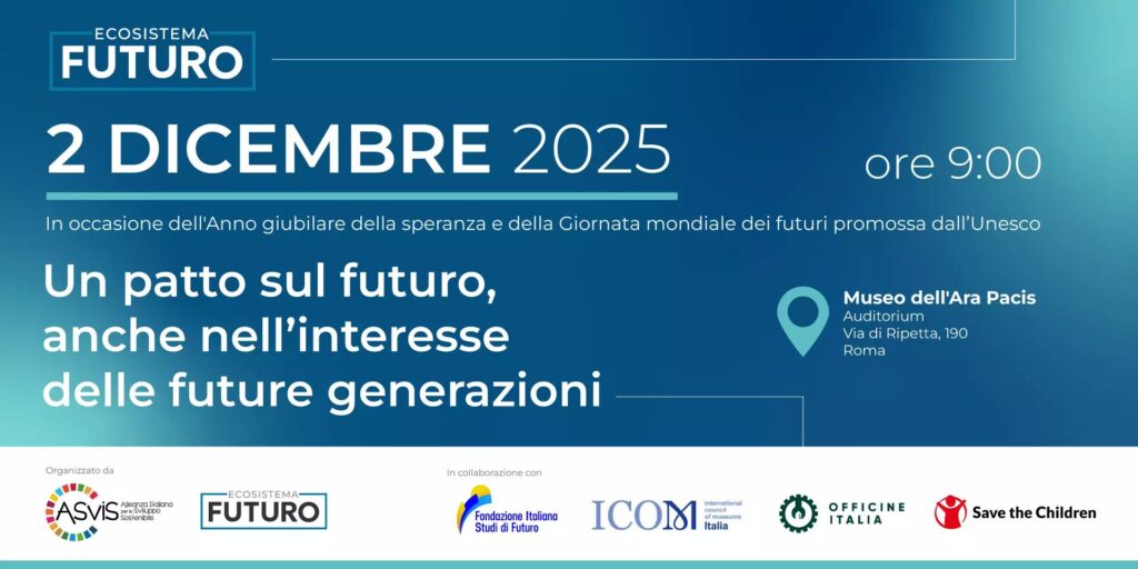 In occasione dell’Anno giubilare della speranza e della Giornata mondiale dei futuri promossa dall’Unesco, il 2 dicembre, presso l’Auditorium dell’Ara Pacis a Roma, si terrà l’evento “Un patto sul futuro, anche nell’interesse delle future generazioni”. La giornata organizzata dall’ASviS, in collaborazione con Icom Italia, Officine Italia, Save The Children e Fondazione Italiana per gli Studi sul Futuro, nell’ambito dell’iniziativa Ecosistema Futuro, nasce con l’obiettivo di posizionare a livello istituzionale e mediatico il tema del futuro, o meglio, dei futuri possibili.