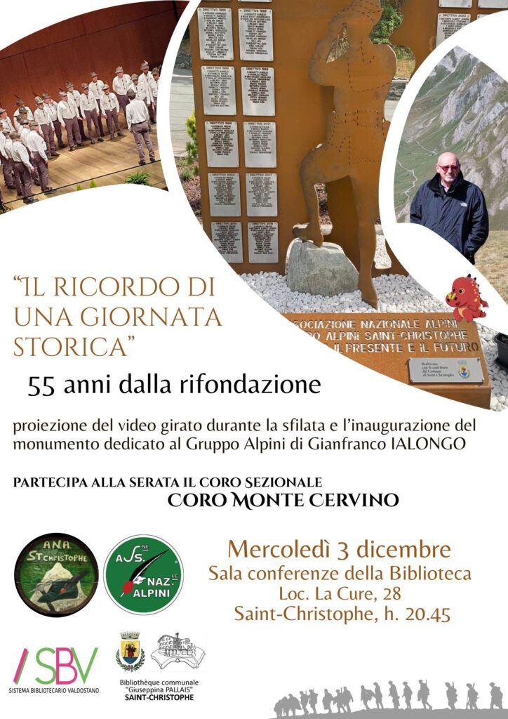 3 dicembre, ore 20.45: la sala conferenze della Biblioteca comunale “Giuseppina PALLAIS” ospiterà la serata “Il ricordo di una giornata storica Gruppo Alpini Di Saint-Christophe 55 anni dalla rifondazione” con proiezione del video girato di Gianfranco Ialongo della sfilata e dell’inaugurazione del monumento dedicato al Gruppo Alpini e partecipazione eccezzionale del Coro Sezionale “Coro Monte Cervino”.