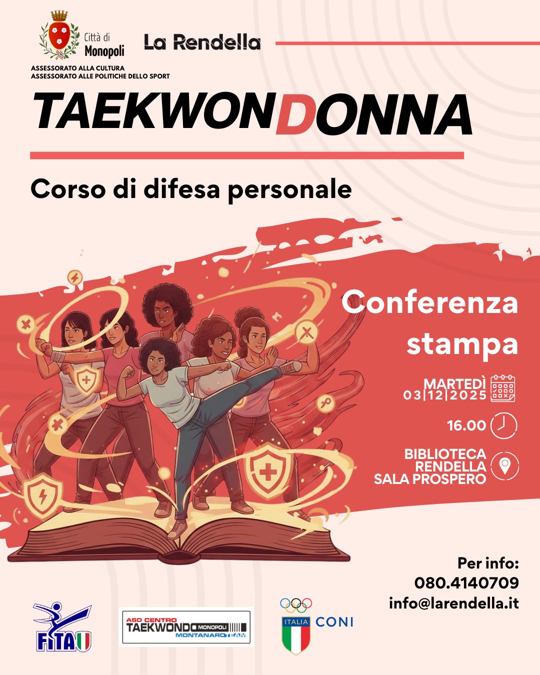 L’Assessore alla Cultura, Rosanna Perricci, e l’Assessore alle Politiche dello sport, Vincenzo Laneve, comunicano che mercoledì 3 dicembre 2025 alle ore 16.00 si terrà presso la Biblioteca civica Prospero Rendella la conferenza stampa di presentazione del progetto Taekwondonna – Corso di Difesa Personale in collaborazione con ASD Centro Taekwondo Monopoli e con la partecipazione delle componenti dell’Associazione Progetto Donna.