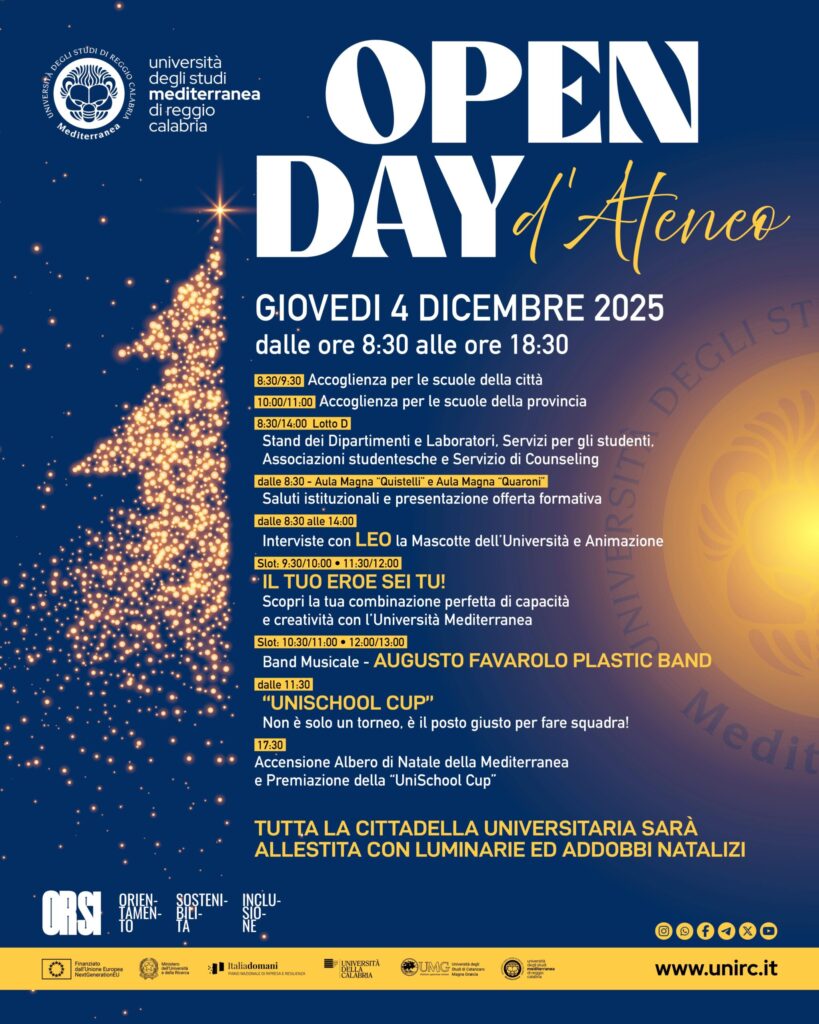Giovedì 4 dicembre 2025 alle ore 9.00 l’Università Mediterranea di Reggio Calabria accoglierà studenti, famiglie e docenti delle scuole superiori per il tradizionale Open Day, una giornata dedicata alla presentazione dell’offerta formativa e dei servizi dell’Ateneo reggino.