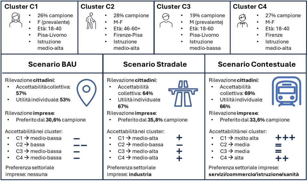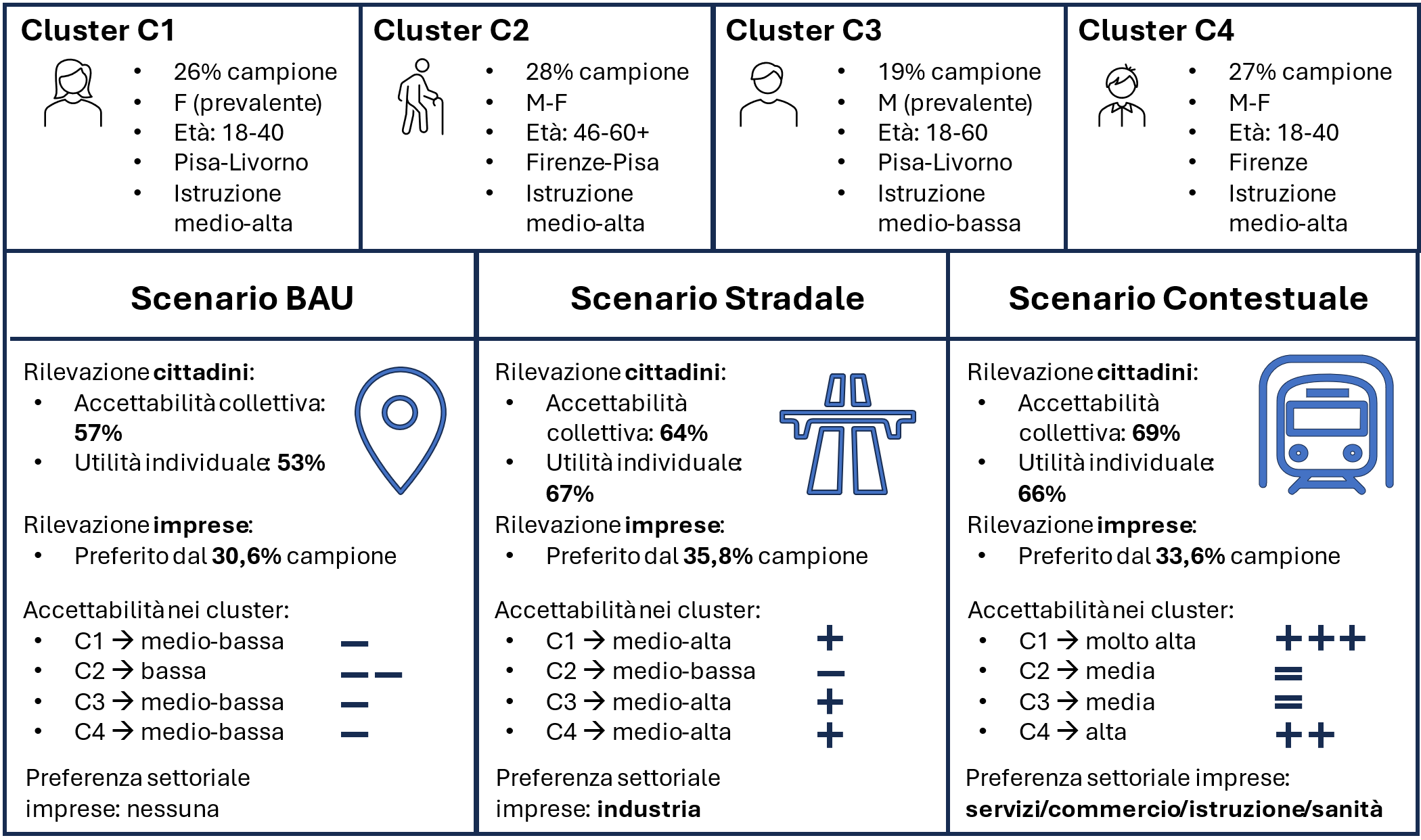 I risultati del progetto hanno portato ad identificare dei profili distinti nella popolazione che propendono verso scenari differenti (Figura 1). I giovani con un grado di istruzione elevato (C1 e C4) favoriscono nettamente lo scenario Potenziamento Contestuale ed in special maniera le sue implicazioni per la collettività (accettabilità collettiva 72% C1-69% C4; utilità individuale 69 C1-68% C4) gli adulti di mezza età e di grado di istruzione più basso (C3) privilegiano il Potenziamento Stradale, particolarmente in termini di utilità individuale (accettabilità collettiva 65%; utilità individuale 68%); gli ultrasessantenni rimangono complessivamente meno favorevoli a tutti gli scenari, pur mostrando differenze di accettabilità meno marcate rispetto agli altri gruppi (Figura 1).