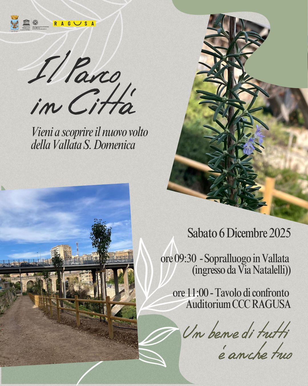 “A pochi mesi dalla conclusione del corposo intervento di riqualificazione della Vallata Santa Domenica – dichiara l’assessore ai Lavori Pubblici, Gianni Giuffrida – vogliamo proporre un momento condiviso in cui le associazioni e ogni cittadino possano cominciare a essere protagonisti del futuro Parco della Città.