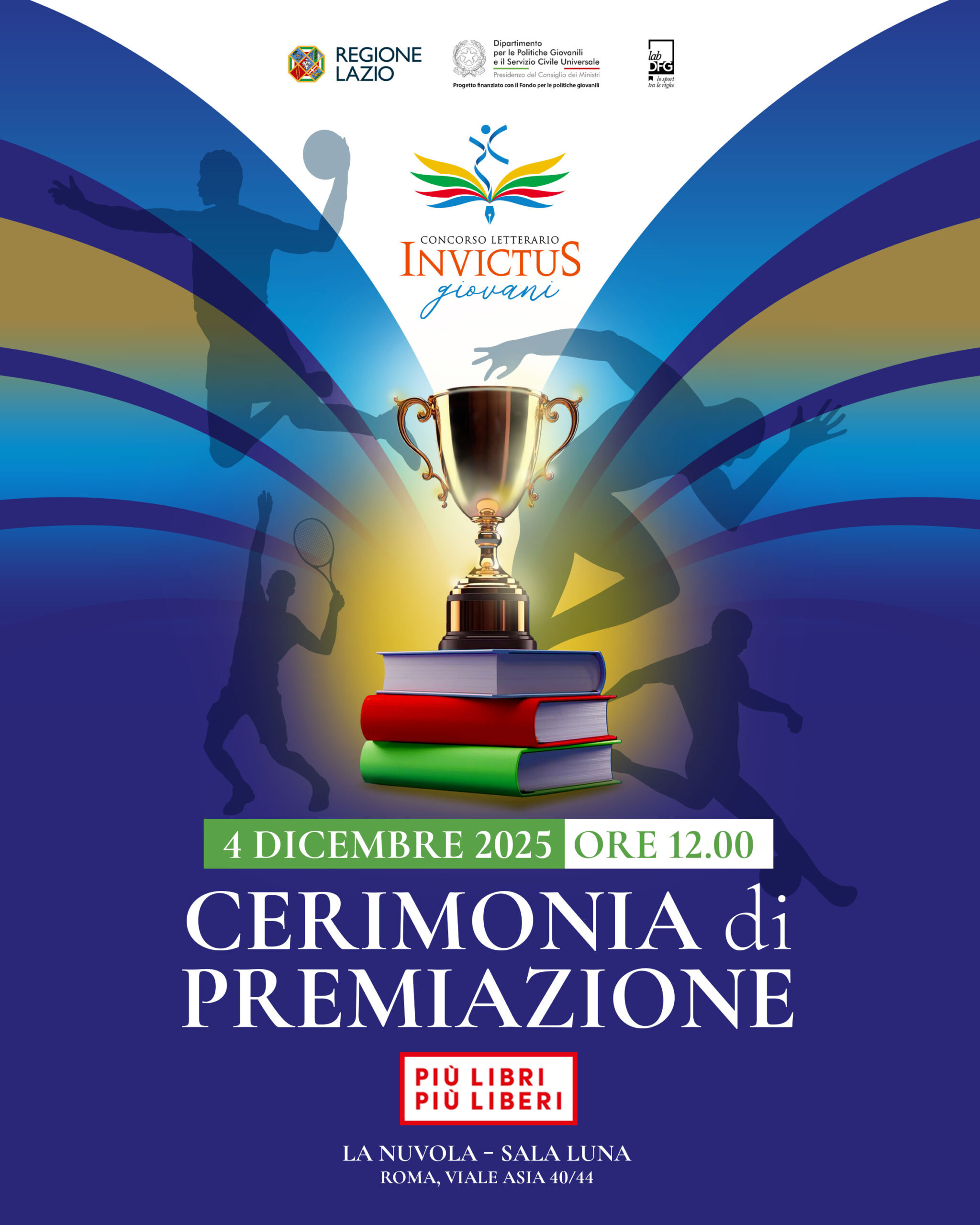 Roma, 3 dicembre 2025 – Si terrà domani, giovedì 4 dicembre alle ore 12.00, in occasione di “Più Libri più Liberi” presso La Nuvola – Sala Luna (viale Asia 40/44, Roma), la Cerimonia di Premiazione del Concorso “Invictus Giovani”, manifestazione promossa dalla Regione Lazio. Il Premio, ideato dall’associazione culturale DFG Lab nell’ambito del progetto “Lazio Libri” e finanziato con il Fondo per le Politiche Giovanili della Presidenza del Consiglio dei Ministri – Dipartimento per le Politiche Giovanili e il Servizio Civile Universale, nasce con l’obiettivo di dare spazio e visibilità a giovani talenti letterari, incoraggiando la narrazione sportiva come strumento di espressione, crescita e condivisione.