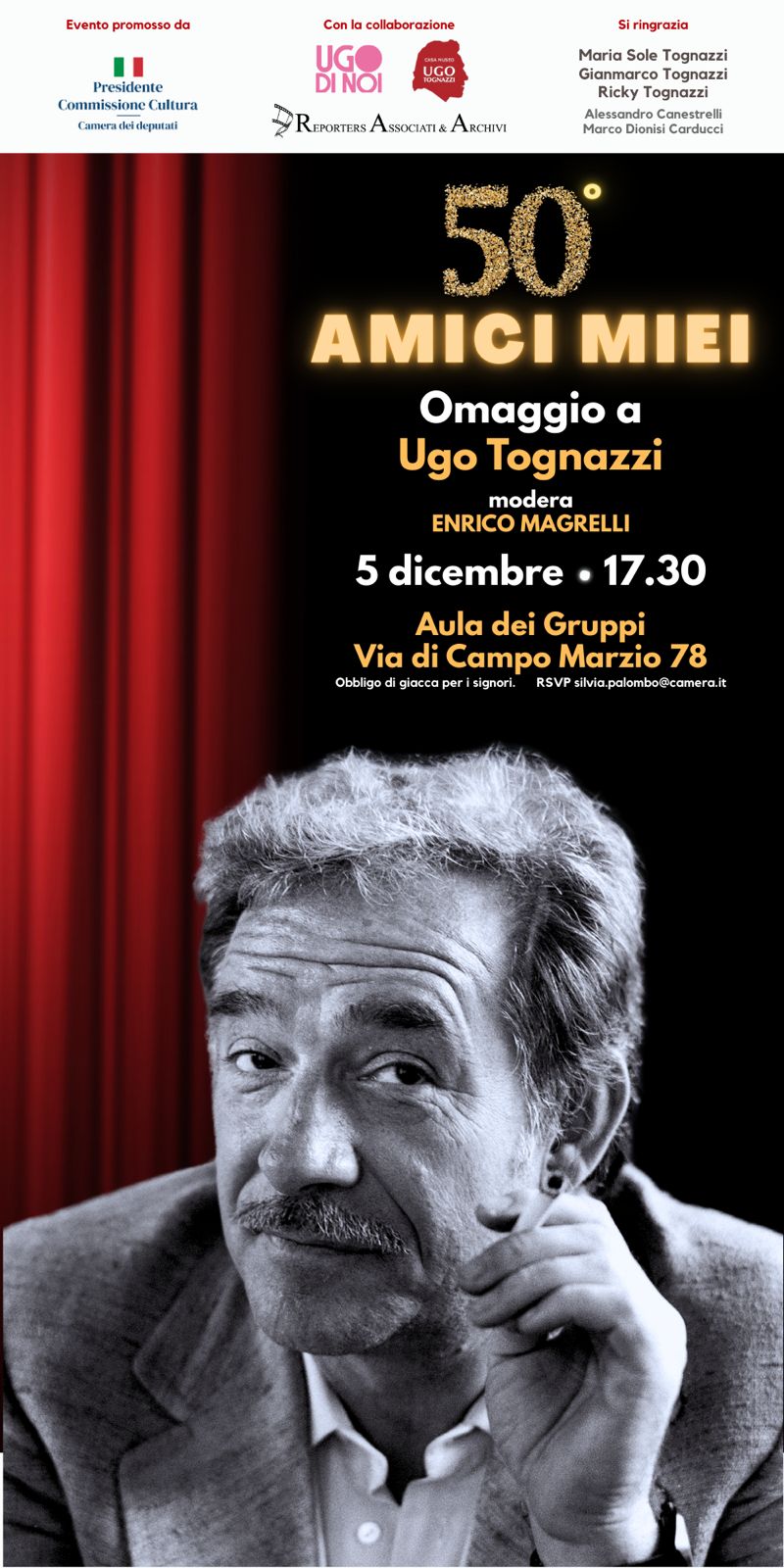 Venerdì 5 dicembre, alle ore 17.30, presso l’Aula dei Gruppi parlamentari della Camera si svolge il convegno “50° Amici Miei – Omaggio a Ugo Tognazzi”. Messaggio del vicepresidente della Camera, Giorgio Mulè. L’appuntamento viene trasmesso in diretta webtv.