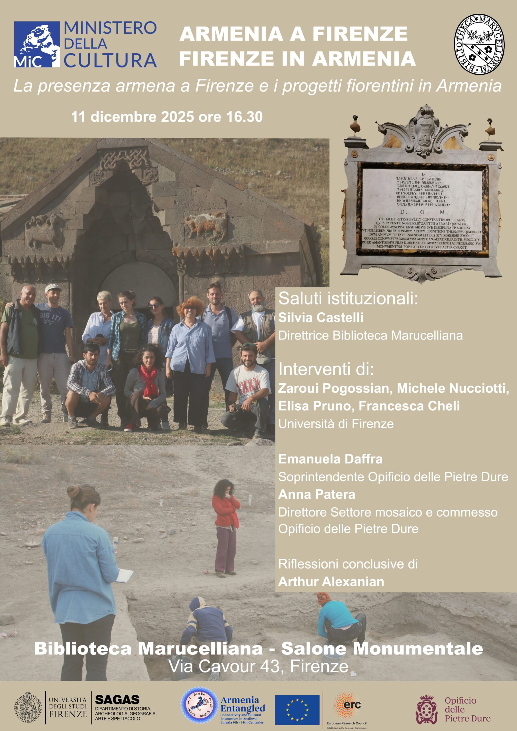L’incontro Armenia a Firenze. Firenze in Armenia. La presenza armena a Firenze e i progetti fiorentini in Armenia, in programma giovedì 11 dicembre 2025 alle ore 16:30 presso il Salone Monumentale della Biblioteca Marucelliana, nasce con l’intento di valorizzare e rendere noto al pubblico il legame antico e profondo tra Firenze e le testimonianze armene presenti in città e, allo stesso tempo, le collaborazioni scientifiche e culturali che oggi lo rinnovano.